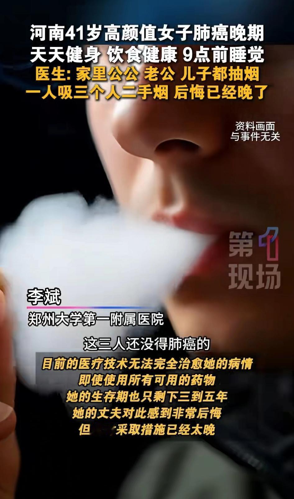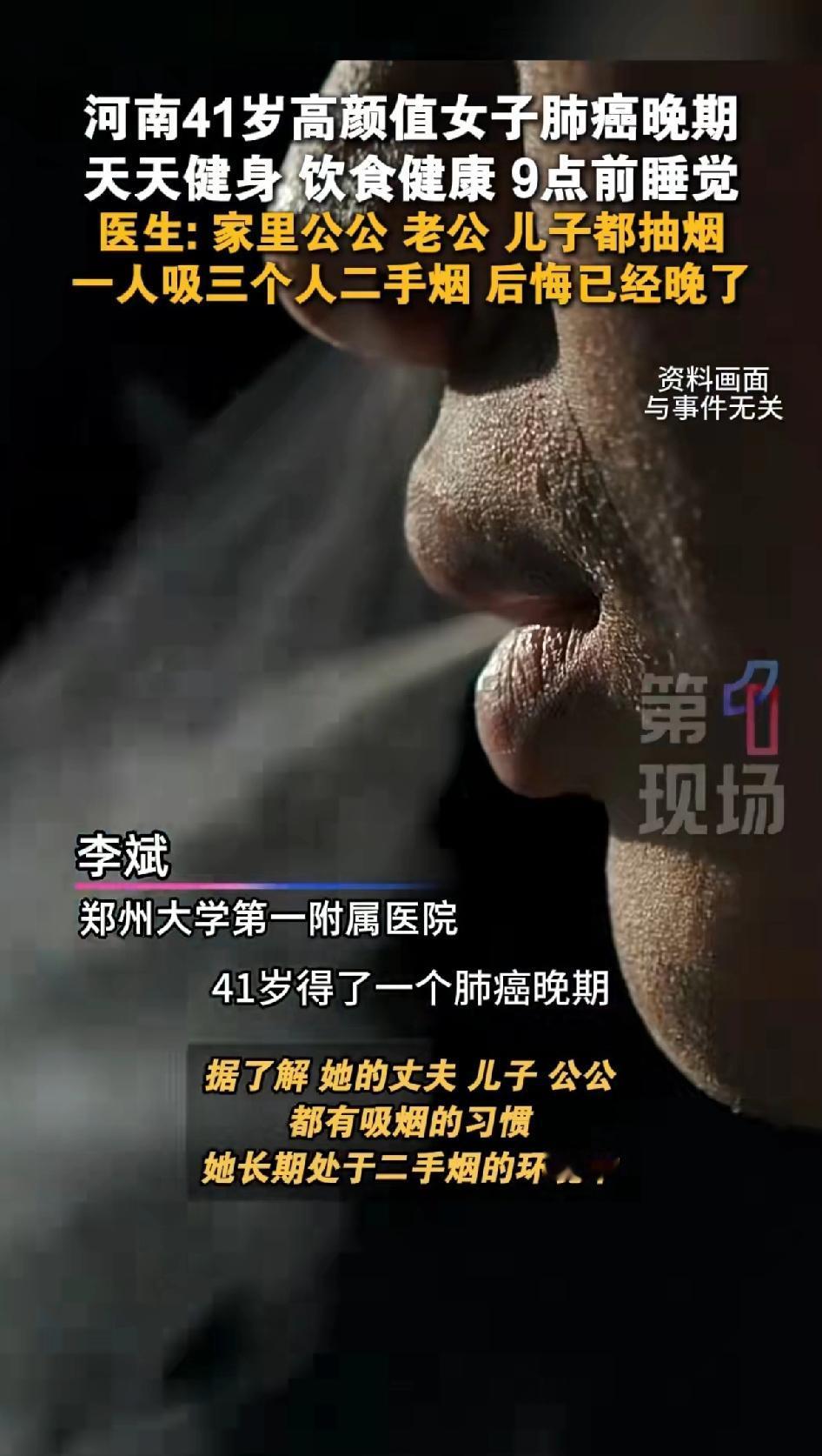 河南41岁高颜值女子肺癌晚期,天天健身,饮食健康 9点前睡觉!生活习惯好得没话说。 实在理解不了为什么这么年轻会得肺癌! 经过医生一了解,问题出在她的家人身上。家里公公、老公、儿子都抽烟,她一人吸三个人的二手烟。 这女子真是太亏了明明自己没有抽烟,却被家人的二手烟害惨了! 医生说,即便所有药都用上,她也只剩三五年时间了。 这真让人唏嘘,一个如此注重健康的人,却被二手烟害成这样。 看来二手烟比一手烟危害更大! 本来注重养生的健康女子 年纪轻轻的才41岁大好年华的年纪,却被癌症缠身!真是可惜! 很多抽烟的人觉得二手烟没啥大影响,可这活生生的例子摆在眼前,告诉我们二手烟的危害有多真实。 所以为了家人健康,戒烟真的刻不容缓!