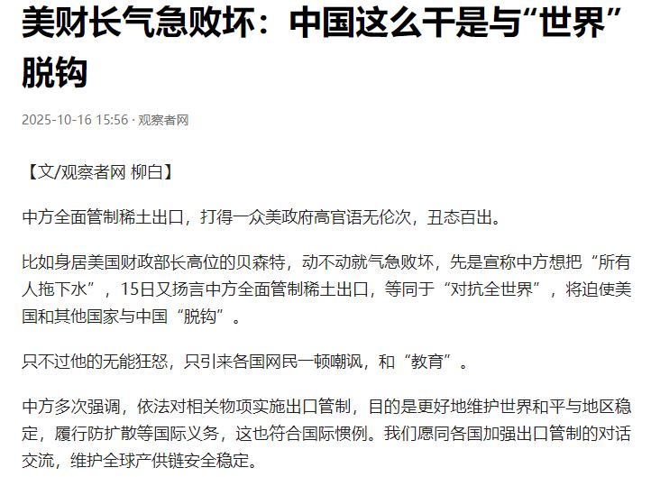 美财政部长贝森特:如果中国执意要做一个全世界信不过的合作伙伴,全世界将与中国脱钩。 贝森特这话一看就知道是谈判没占到便宜,急了眼说的气话。咱们这些年在全球产业链里一直扮演着负责任的角色,不管是对合作伙伴还是国际市场,从来都是守规矩、讲诚信,说我们“信不过”,那真是没道理的冤枉话。 贝森特真正盯着的,其实是咱们10月9日开始实施的稀土管制政策。但咱们这政策可不是“一刀切”,严格归严格,却特别讲道理,符合世界贸易组织的规矩。 普通老百姓用的民用稀土,只要按正常流程申请,该给的肯定给,绝不会卡脖子。真正管得严的,是那些可能被用到军事上的稀土,毕竟这东西一旦成了武器的“零件”,就可能威胁到全球安全。 咱们追着问清楚用途,就是想避免它被拿去搞军事对抗,这明明是维护和平的好事,怎么反倒成了“信不过”了? 说到底,美国真正纠结的,恐怕是没法随意把稀土用在军事上吧?这事儿反倒该让美国给全世界说清楚:到底是想合作发展民用产业,还是打着合作的幌子搞军事扩张? 之前我商务部也说得很明白,搞稀土管制一是为了国家安全,二是也考虑到国际市场的正常需求,既没歧视谁,也没搞不合理限制。 这些年中国一直是全球稀土的主要供应方,多少国家的高科技产业都靠着咱们稳定的供应才能正常运转,就算现在加强管理,开放合作的大门也从来没关过。 现在全球经济早就像一张大网,各国都连在一起,“脱钩”这种话听着吓人,实际上根本行不通,对谁都没好处。就说美国自己的汽车、电子企业,多少生产线都依赖中国的稀土供应链,真要是脱钩,他们的成本得涨多少,工人会不会失业? 我们一直认准了自由贸易和多边合作这条路,就是因为知道只有大家一起好好合作,产业链才能稳,经济才能发展。贝森特想用“脱钩”威胁咱们在稀土问题上让步,那真是打错了主意。 我们该守的原则自然不会放松,合理合法的管制政策也会一直执行下去,既要护好自己的国家利益,也要为全球安全出份力。 那些动不动就喊“脱钩”的狠话,最后只会是白费口舌,根本动摇不了我们按规矩办事的决心。