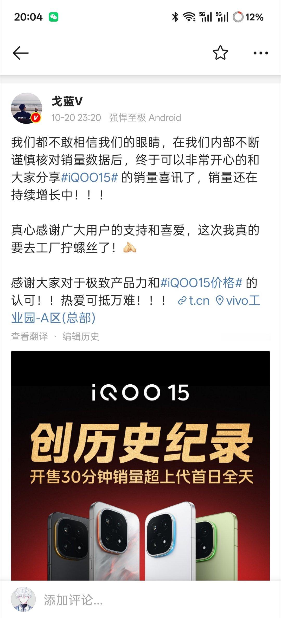 iQOO 产品经理 戈蓝发文汇报:iQOO 15 手机创历史纪录,首销日获 2025 年天猫安卓新品冠军。