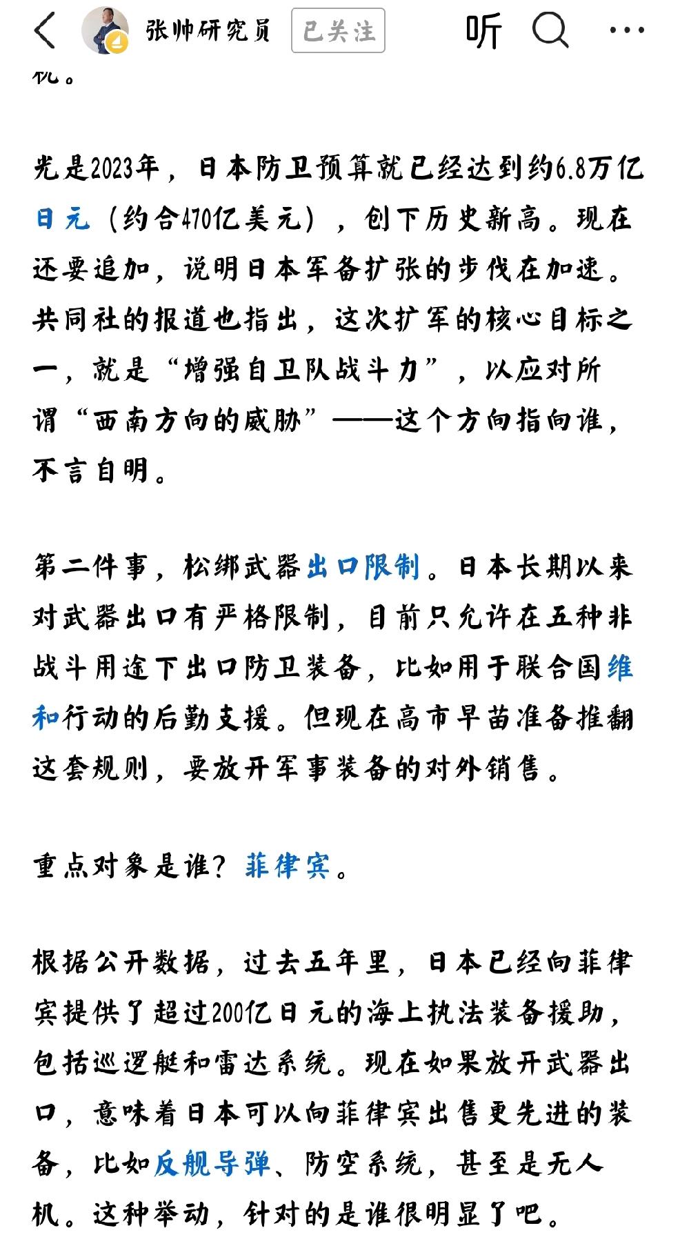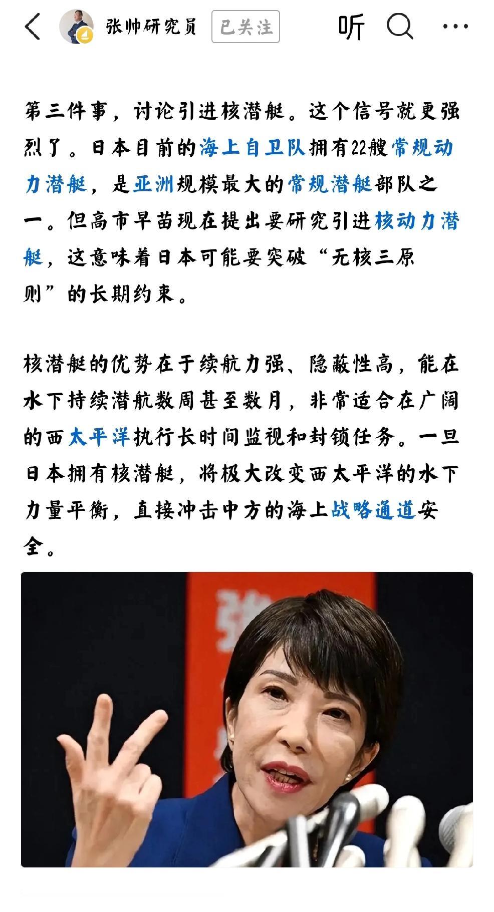 高先生,真乃神人也 由衷的钦佩,高志凯,高先生。果然指出了日本的本质,高市早苗刚刚当上首相,就做出了3点指示:增加军费,松绑武器出口限制,讨论引进核潜艇。