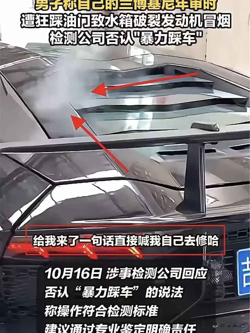 四川成都,男子开800万豪车去年审,竟被工作人员几脚踩到排气管喷火,发动机没撑住