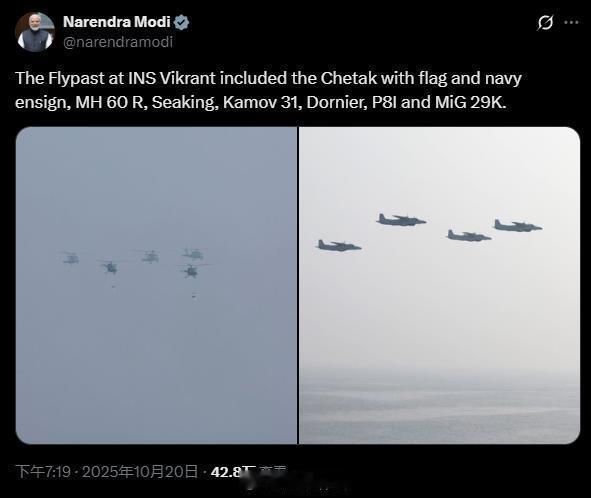 10月20日,往年都去中印边境或者印巴边境部队过节慰军的莫迪,今年排灯节(印度教新年)罕见选择在印度“第一艘国产航母”“维克兰特”号(Vikrant,勇敢)度过,并安排了印度版的“阅舰式”。莫迪称在五月“朱砂行动”中印度三军用命,“迫使巴军投降”。莫老仙真是个半仙,全力鼓吹造神话。