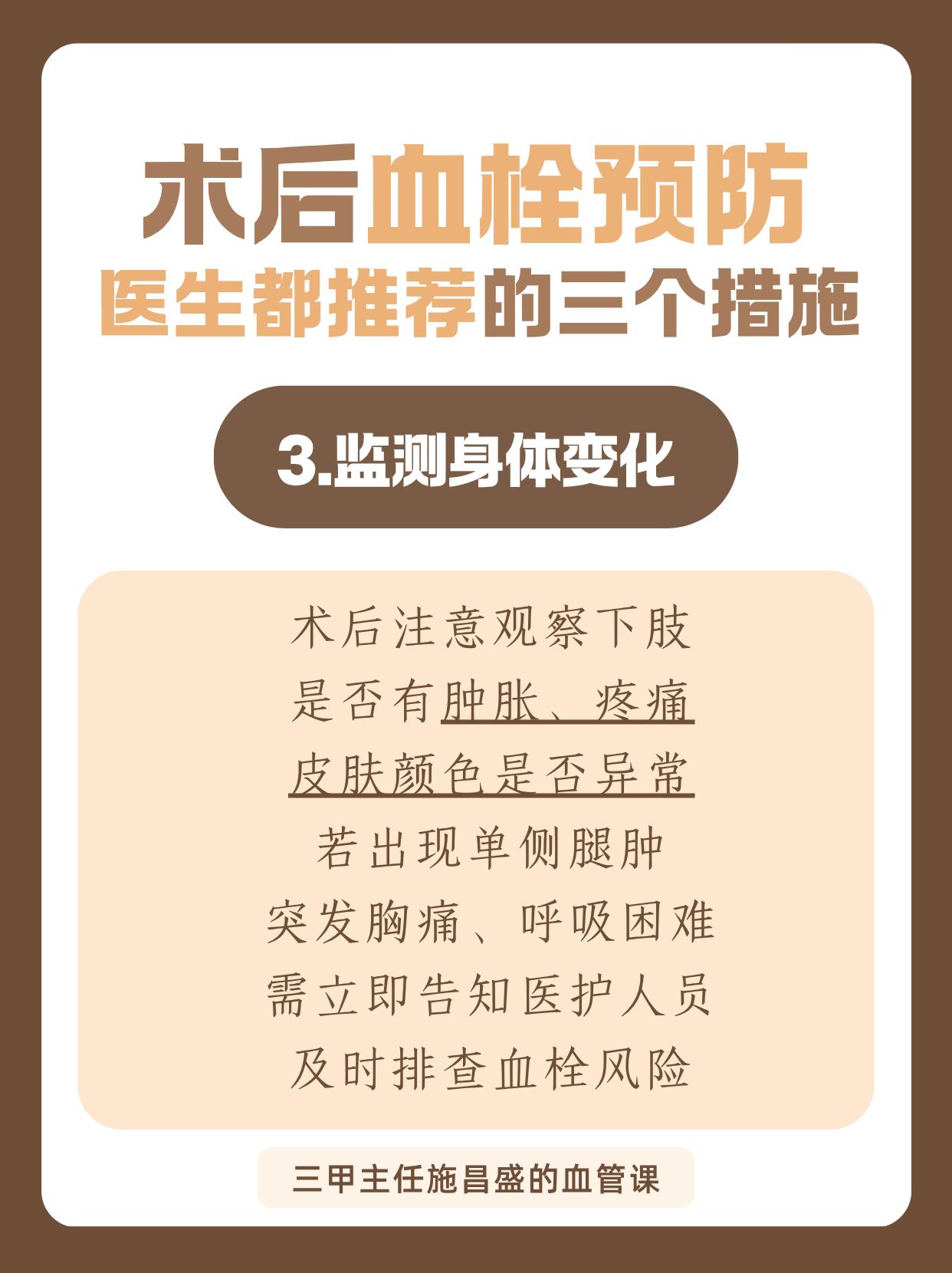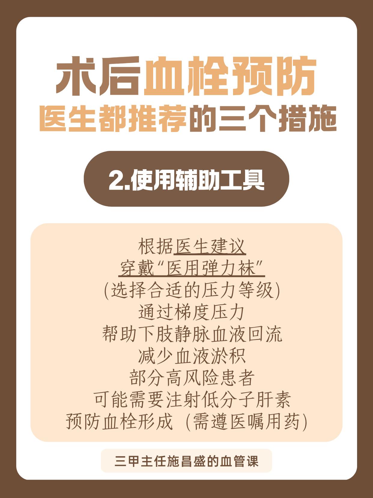 术后血栓预防:医生都推荐的三个措施。手术患者(尤其骨科、妇科)是血栓高危群体。术后降低风险可这样做:早期在医生允许下活动,无法下床就在床上做动作;按建议穿戴弹力袜,高风险者遵医嘱用药;留意身体变化,出现异常立即告知医护人员。