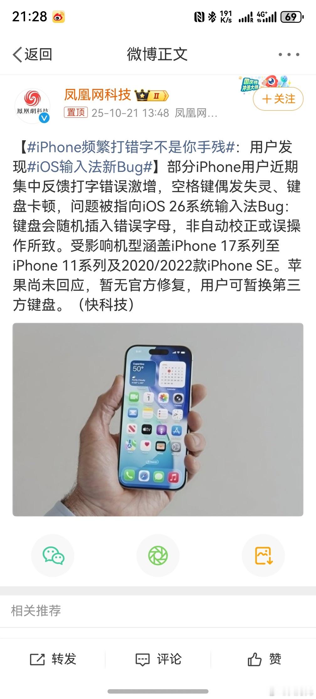 iPhone频繁打错字不是你手残 ,我只能说这几年的苹果真的是没法评价,曾经以流畅、 bug少著称,结果现在两个都成为他的反向优势了。[允悲]