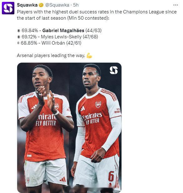 斯凯利太离谱了,之前看他在青年队,超强对抗,身上挂着个人都能在中路推进,结果没想到他到了一线队还能这么踢,Squawka也盘点了自上赛季欧冠对抗成功率榜单(至少完成50次对抗),枪手两将排名前二,具体如下: