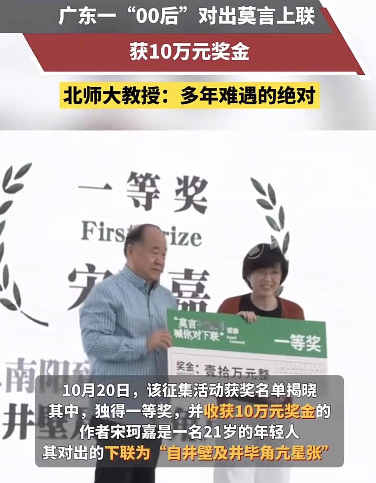 奖金10万,经过4个多月的角逐,北大教授赞不绝口:“多年难遇的绝对”,下联出来了! 莫言的上联:“从南阳到南洋根深叶茂!” 00后宋珂嘉对出的下联:“自井壁及井毕角亢星张!” 有谁拆解一下,我是真的看不懂 莫言,从南阳到南洋,感觉很普通!可以理解是数百年来许多广东人下南洋讨生存求发展开拓事业开枝蔓叶的历史。自井壁及井毕又角亢星张,表达了什么意境?和上联有何对应?说实话,除非有条虫自井底通过井壁爮出来,后来飞升成仙成星宿,感觉就是凑字来对,沾了点28星宿名的边边。 还有北大教授所说的:百年不遇的绝对,那是高抬了!只有那种能在民间广为流传,经得起历史考验经久不衰,深入人心的对联才是真正的好对联!这样的对联从什么角度去看,顶多就是一种文字游戏而已,根本就谈不上具备有什思想性和艺术感染力。
