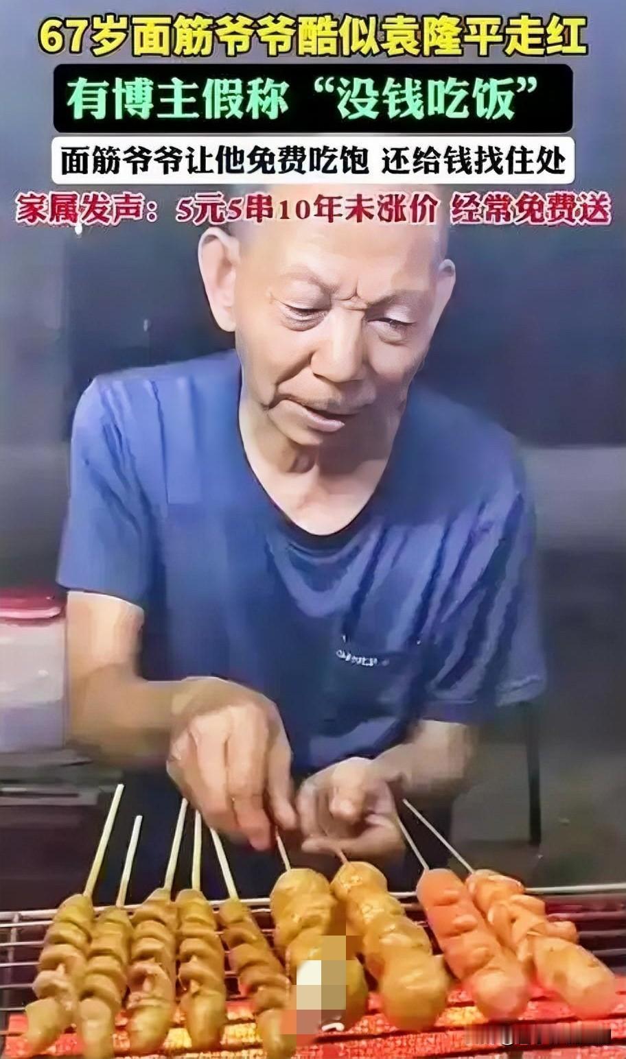 近日,山西祁县67岁的“面筋爷爷”宁保林因酷似袁隆平院士而走红网络。他十年如一日在街头售卖1元1串的烤面筋,即便成本上涨也坚持不涨价,只为让老顾客吃饱吃好。面对求助者,他总是慷慨解囊,免费赠送食物。这份朴实与善良,让网友在他身上看到了袁隆平院士的影子,引发了广泛共鸣。