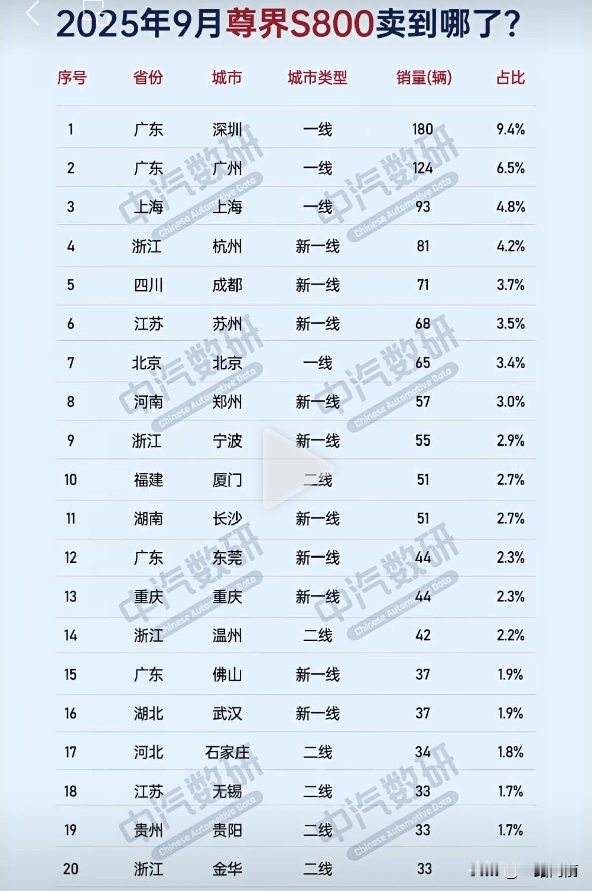 2025年9月尊界S800卖到哪了? 果然这些城市老板最多 深圳以180辆、9.4%的占比稳坐销冠,广州、上海紧随其后,前二十城市里一线城市和新一线占了大半,这高端定位算是焊死了! 先看最狠的“南方霸榜”局面。广东一省就承包了深圳、广州、东莞、佛山四个销点,加起来贡献超20%的销量,珠三角简直是尊界的“福地”。深圳车主王哥说得实在:“这车在科技园、前海这些地方能见度太高,充电场站经常碰到同款,群里一喊就凑齐十几辆自驾。” 广州、上海的热销更印证了“一线城市吃高端”的规律,毕竟50万级的尊界S800,本身就瞄准了高收入、爱尝鲜的城市精英。 新一线城市的表现更让人意外。杭州、成都、苏州这些城市销量都排进前十,尤其是杭州81辆、成都71辆的成绩,说明尊界不仅靠一线城市撑场面,新一线的“中高产家庭”也在疯狂买单。有成都车主晒单:“家里第二辆车选它,就是看中鸿蒙智驾和后排的‘躺平模式’,周末带娃去都江堰,高速上自动开着太省心。” 更绝的是“城市类型密码”。前二十里,一线+新一线城市占了17席,二线城市只有厦门、温州、石家庄等零星几个,这和尊界的定价、配置完全匹配,毕竟能花大几十万买车的,大多集中在经济活跃、消费力强的大城市。北京虽然是一线城市,但65辆的销量比深圳少了一半多,北方市场的“慢热”和南方的“爆发”形成鲜明对比,估计和气候、充电设施普及度有关。 尊界能在这些城市卖爆,根本是“产品精准踩中需求”。它的智驾系统在复杂路况多的大城市更实用,超大空间和豪华配置又满足了家庭用户的面子和里子需求。有行业人士分析:“尊界S800的热销,其实是‘城市高端新能源’的缩影,未来这类车型想卖得好,就得死死绑定大城市的中产家庭。” 不过也有疑问:北方市场和二线城市啥时候能追上来?要是尊界推出更亲民的配置,会不会在更多城市开花?