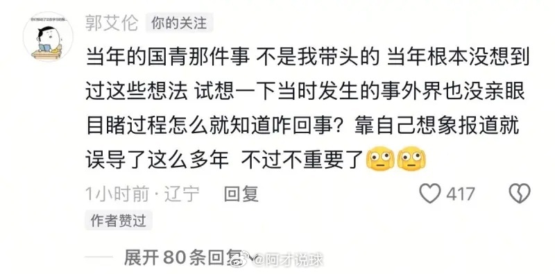 郭艾伦再谈“国青血书门”事件,他说道:“当年的国青那件事不是我带头的当年根本没想到过这些想法试想一下当时发生的事外界也没亲眼目睹过程怎么就知道咋回事?靠自己想象报道就误导了这么多年不过不重要了”。