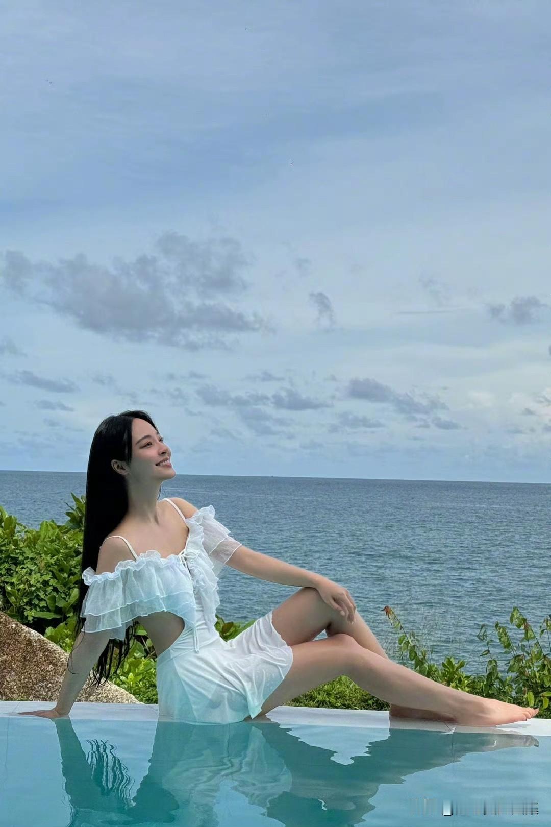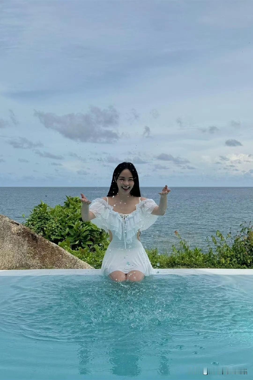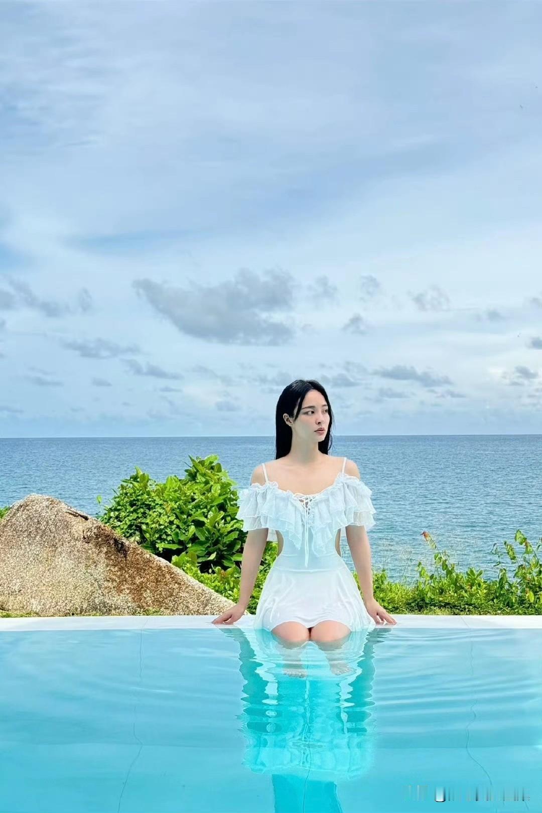 李莎旻子度假风美拍,穿白纱裙戏水浪漫甜美