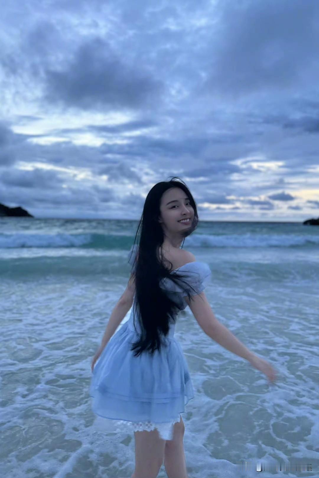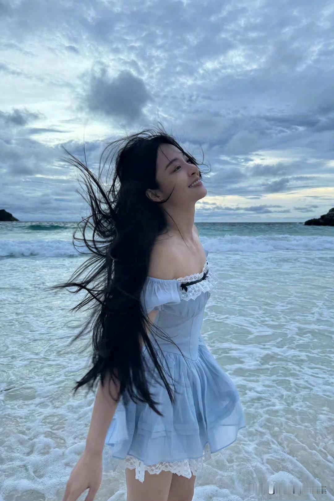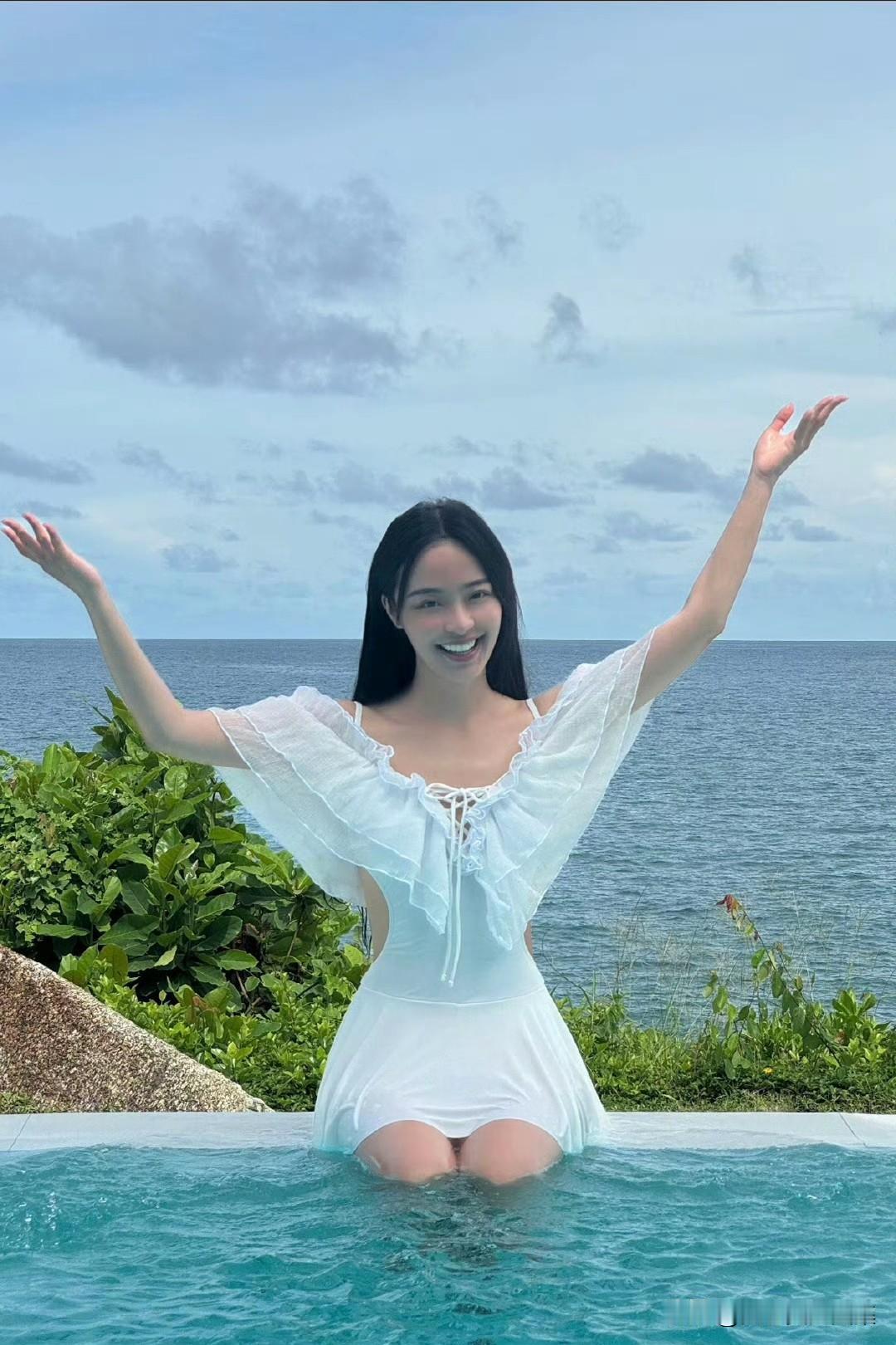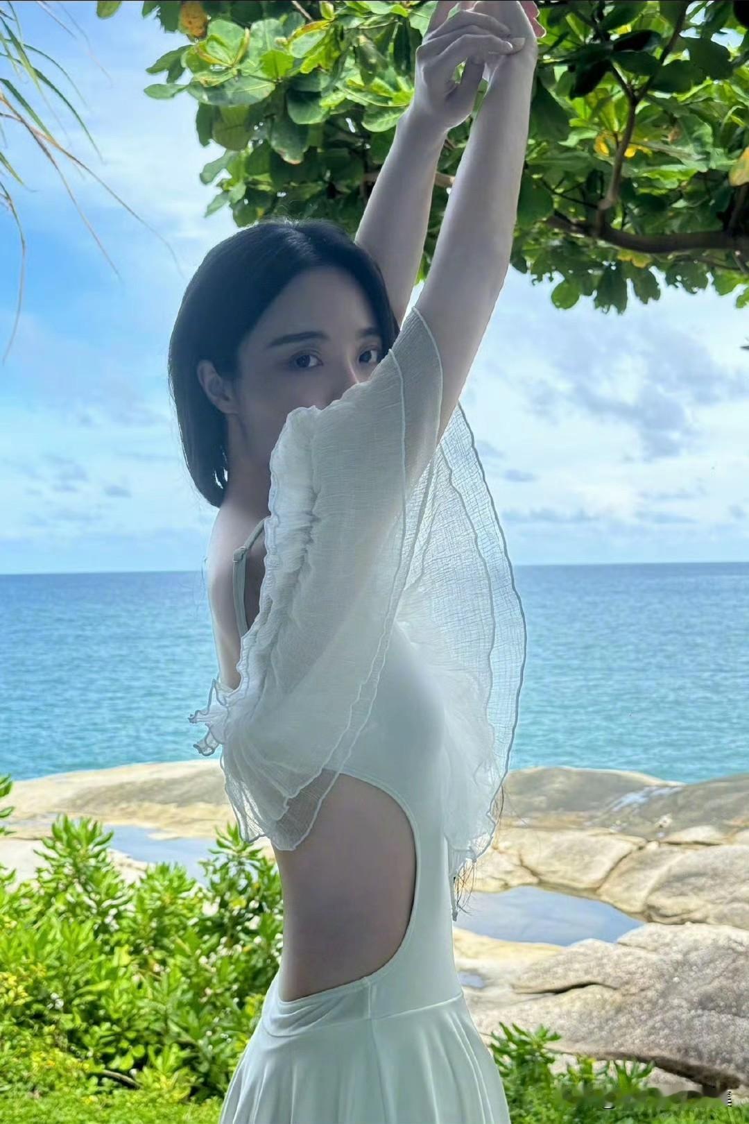 李莎旻子度假风美拍,穿白纱裙戏水浪漫甜美