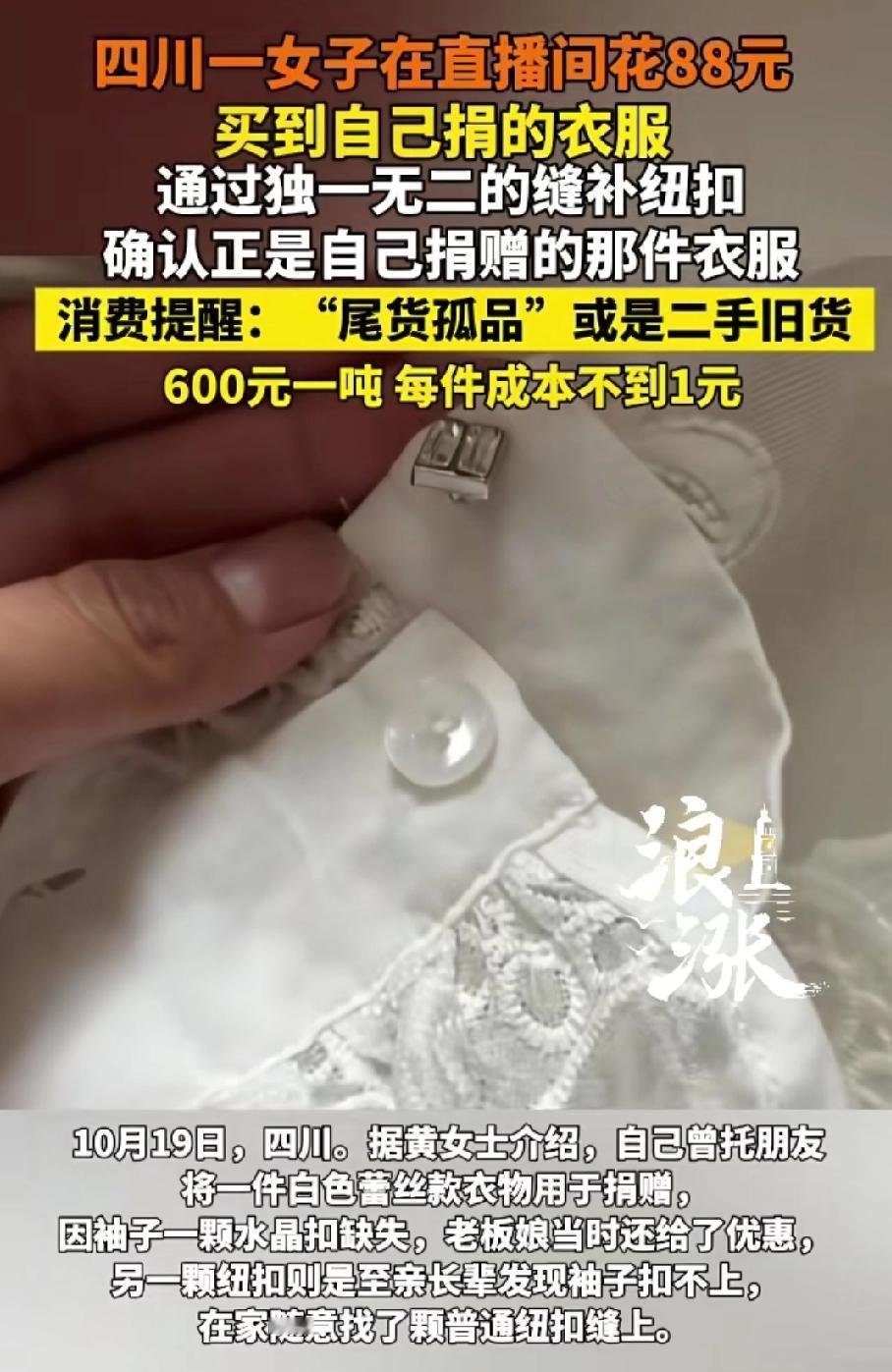 万万没想到 四川一女子花88元在直播间买的衣服,竟是自己曾经捐出去的衣服! 据当事人表示,当时是因为袖子上掉了一颗水晶扣,老板娘给了优惠,回头仔细一看,原来另一颗纽扣是当时家人随便找了个普通扣缝上去的。 此前曾有报道曝光过类似事件,有的直播间所谓的“尾货孤品”,其实有可能就是二手货。 这些旧衣成本600元一吨,算下来每件不到1元。 有些商家为了谋取利益,将回收的旧衣当“新衣”卖,有时候真是让人防不胜防。