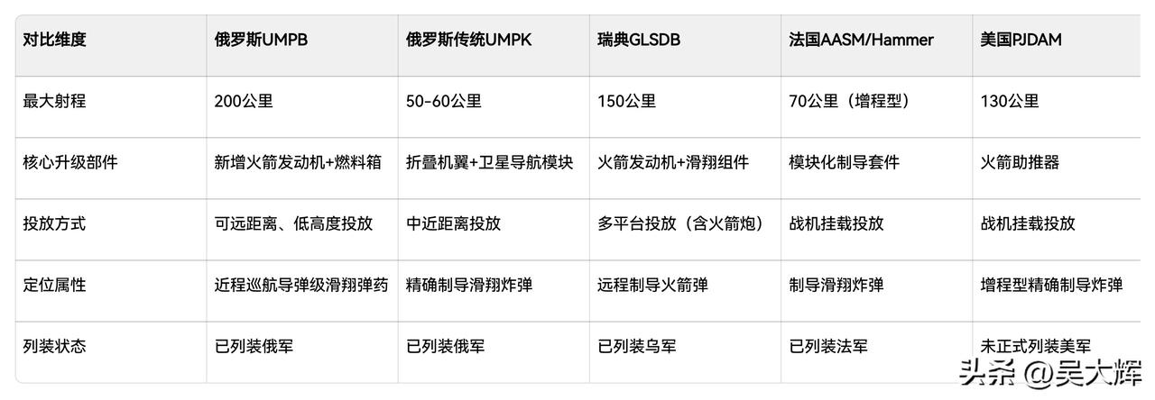 【俄军列装近程巡航导弹级的滑翔弹药】 10月20日,乌克兰军情总局通报称,俄方已开始使用射程达200公里的滑翔炸弹打击其阵地。这大概率是指配备了通用滑翔修正模块(UMPK)的自由落体高爆炸弹(FAB)和温压炸弹(ODAB),该类炸弹此前射程仅60-70公里,而新型号已能打击乌军后方城市。 这款新型弹药很可能是通用多兵种滑翔弹药(UMPB),是在冲突中表现出色的UMPK基础上升级而来。UMPK由折叠机翼和卫星导航模块组成,可装配在250公斤级以上的自由落体炸弹上,能使炸弹以高精度打击50-60公里外的目标。 UMPB将射程提升至200公里,核心得益于新增的火箭发动机和燃料箱,为弹药提供了额外的水平速度。这不仅能让战机从更远距离投放炸弹,还可降低投放高度。本质上,UMPB更接近近程巡航导弹,而非传统航空炸弹。 该新型弹药将使俄罗斯空天军大幅提升对乌军已探明阵地和目标的打击深度,包括后方的弹药、燃料和物资储备梯队,以及远离前线的人员休整区。事实上,俄轰炸机部队由此获得了与瑞典GLSDB、法国AASM/Hammer和美国增程型联合直接攻击弹药(PJDAM)性能相当的装备。 值得一提的是,美国空天军尚未正式列装PJDAM,尽管其测试本应在2023年初完成。这意味着曾在精确制导炸弹领域大幅落后于美国的俄罗斯,成功实现了反超。