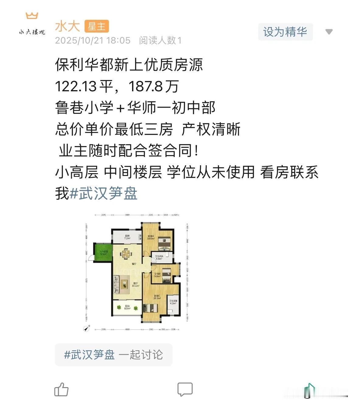 今日美居 工抵房价格美丽,二手房价格友好,祝你安家大武汉。保利华都最大的问题,还是房龄大了,另外一个是地势比较低。 在武汉,房龄其实挺重要的,是价格的敏感因子,基本房龄超过十年,就难言品质,然后就不太保值了。可是新房不断有,新房交房,马上就是二手,难道每十年就要换一次房?