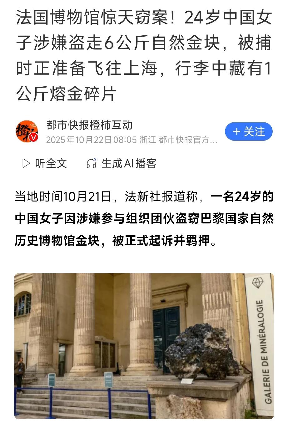 你绝对想不到,一个24岁的中国姑娘,居然被卷进法国自然历史博物馆的金块盗窃案,整整6公斤的自然金不翼而飞。 事情发生在九月中旬,巴黎那家著名的自然历史博物馆。监控拍到她穿着黑衣服,趁着闭馆前的混乱,提前躲进展厅。 这姑娘手法相当专业,不是硬闯,而是等夜深人静,用角磨机切开了几厘米厚的钢制安全门。 更夸张的是,面对防弹玻璃展柜,她直接上氧乙炔焊枪,三千度高温几分钟就熔了个洞,全程没触发警报。 拿走的金块里,有的还是沙皇尼古拉一世送的,文化价值根本没法用钱衡量。 得手后她立刻逃往西班牙,结果在巴塞罗那机场准备飞上海时被抓,行李里有一公斤已经熔掉的金块碎片。 警方说这绝不是临时起意,背后很可能有团伙在操作,剩下的金块估计早就通过黑市流出了。 说实话,这种把百年标本熔了卖钱的行为,真的又蠢又坏。 文物是属于全人类的记忆,再值钱也不能这么干。 希望剩下的金块能早日追回,也给那些想打文物主意的人提个醒:手别伸太长,伸手必被捉。