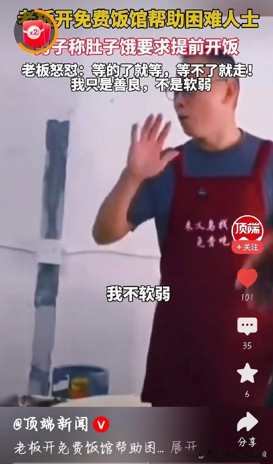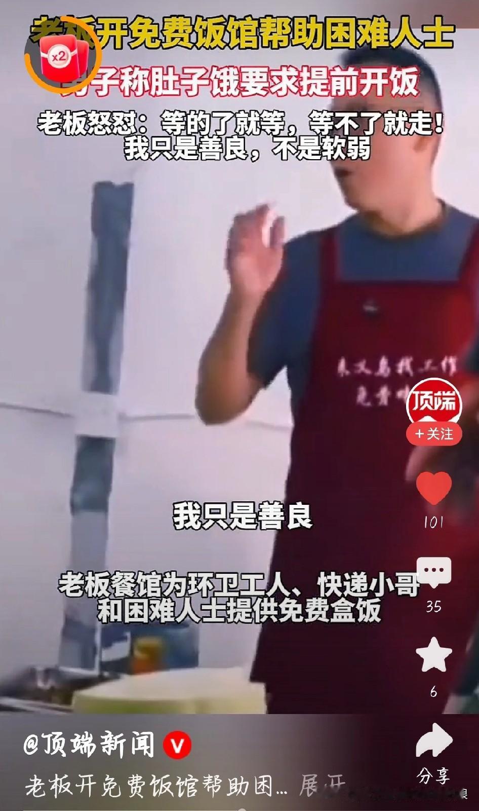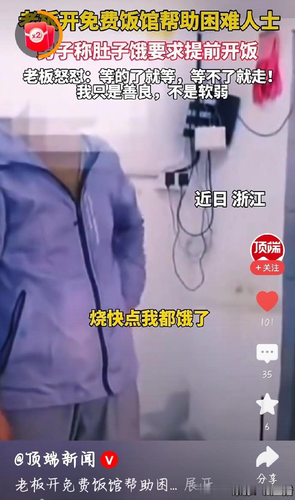 义乌那家给困难人送免费盒饭的馆子,出了个让人窝火的事。有个男的找上门,上来就喊:“10点就该开饭,烧快点,我饿了!” 顺手还想拿店里的垃圾袋。 老板直接没惯着,当场怼回去:“我是善良不是软弱,别在这发号施令!” “你不是大爷,我也不是店小二,饭店都有开饭点,等不了就走!” 这话一出,周围人都觉得解气。 要知道这馆子是给环卫工、困难打拼者准备的热乎饭,人家凭心意做事,可不是伺候人的地方。免费的善意是情分,不是本分,更容不得这般得寸进尺。 善良就得有底线,老板这波硬气必须点赞!惯坏了这种“伸手党”,才是寒了真正好心人的心。男子在免费饭馆要求提前开饭被怒怼 免费饭馆