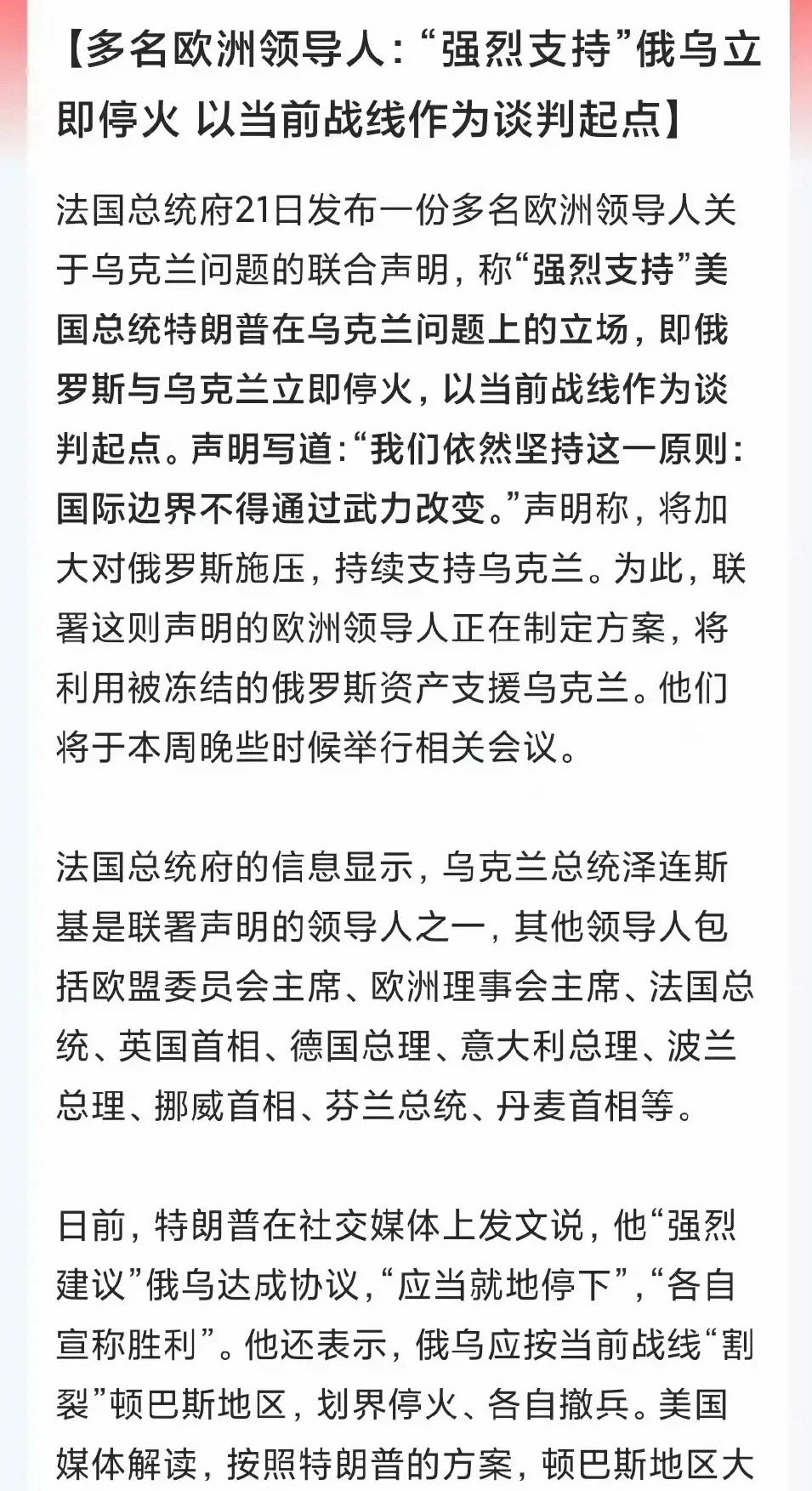 欧洲领导人发布联合声明,表示他们“强烈支持俄乌立即在当前战线停火,并以此为基础启动和谈”!