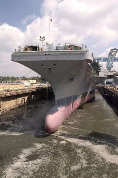 航母上宽下窄,为什么不会发生侧翻?因为水底下的航母,才是航空母舰的技术精髓。   咱们平时看航母,总觉得它露在水面的部分又宽又大,像个扁平的大平台,底下却好像细细的,难免会犯嘀咕:这要是遇到大风浪,不得跟倒放的三角板似的翻过去?其实这都是错觉,就像看见冰山露在水面的尖儿,哪知道水底下藏着大半截敦实的身子。   要是能去船坞里看看待下水的航母,就明白水下的船体压根不窄,反而宽得很,船底还是平的,跟咱们想象中 “尖细船底” 完全不一样,这才是航母稳当的底气。   更关键的是水下部分的重量分布,简直是把 “压舱石” 用到了极致。航母最沉的家伙全在水线以下藏着:核动力航母的反应堆、常规动力的巨型发动机、装满燃料的大油箱、存着弹药的弹舱,还有驱动螺旋桨的传动系统,每一样都重得吓人。   就拿美国的福特号来说,上面宽宽的飞行甲板和空旷的机库,重量加起来才占整艘船的十分之一,剩下的九成重量全在水下。这就好比在一个沉重的实心铁桶上粘了个大空盒子,不管上面的盒子怎么晃,底下的铁桶稳稳扎在水里,自然倒不了。   这里面藏着个简单的道理,跟咱们玩不倒翁一个意思,但又不完全一样。船在水里能浮着,靠的是水的浮力,浮力的中心点叫浮心;船自身重量的中心点叫重心。航母水下重、水上轻,重心就稳稳落在水线以下,还正好在浮心的正上方。   一旦遇到风浪让船往一边歪,浮心会跟着移到重心的外侧,这时候就会产生一股把船往回拽的劲儿,专业说法叫 “复原力矩”,说白了就是水在底下 “扶” 着船,让它赶紧回正。有这股劲儿在,哪怕风浪把甲板吹得倾斜不少,也能慢慢晃回来,从来没听说过航母因为风浪翻沉的。   水下还有专门的 “平衡调节器”,就是压载水舱,这可是航母的 “秘密武器”。这些分布在船底两侧的大柜子,能随时加水放水调整重量。比如右边的舰岛太重了,左边水舱就多装些海水平衡;要是燃料用掉不少,船身变轻了,就往水舱里多灌点水,把重心压得更低。之前有艘航母执行任务时,一边的弹药消耗太多,船有点往另一边偏,船员们就是靠调节压载水,没一会儿就把船调稳了。这就像挑担子,一边轻了就往这边加点重物,自然不会歪倒。   水下的减摇鳍更像是航母的 “鱼鳍”,能主动跟风浪 “较劲”。这些长得像机翼的金属板藏在船身两侧水下,风浪大的时候,减摇鳍会自动转方向,让水流在上面产生一股反作用力,抵消风浪带来的晃动。   有次福特号海试时故意急转弯,船体倾斜得厉害,甲板都快歪到水面了,就是靠减摇鳍快速发力,没一会儿就稳住了,海水都没打上船头。要是换成上下一样粗的远洋邮轮,遇到这情况早晃得不行,甚至可能让海浪打上甲板进水,那可就危险了。   上宽下窄的造型不光不危险,反而帮了大忙。因为水线以上突然变宽,海浪想往上爬都难,就像有个大挡板挡着,很少有海浪能越过船头打到船里面。而且水线每往上移一点,航母排开的水量就会成倍增加,浮力跟着变大,等于风浪越大,水的 “托力” 越足。反观那些上下差不多粗的船,海浪容易爬上来,浮力增加得又慢,反而更容易翻。   这么一捋就清楚了:不是航母上宽下窄天生稳,而是水下的设计把所有不稳定因素都解决了。敦实的水下船体、压在底部的重设备、能调重心的压载水舱、能抗风浪的减摇鳍,这些藏在水下的技术精髓,才让航母顶着宽宽的甲板,也能在大海里稳如泰山。   要是把水下部分的这些设计去掉,光留着上面的宽甲板,那肯定早就翻了。所以说,看航母别光看上面多威风,水下的功夫才是真本事。