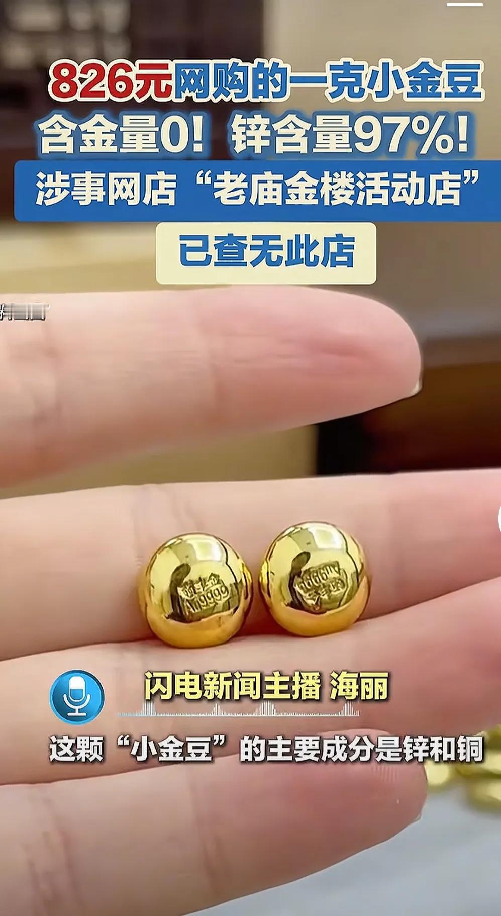 黄金也能这么假,让人震惊! 喜欢买黄金的看过来, 浙江温州一位女士在网络平台上网购了一克的小金豆豆,准备每个月存一颗,这一克金豆豆的售价826元,价格还是低于市场价的,结果令她想不到的是,检测里面的含金量居然为0,而锌含量高达97%。这家网店的名字叫“老庙金楼活动店”。 出事之后,这家店也变成了查无此店,记者打电话给老庙黄金,结果人家根本就没有这家网店。 老百姓网上买东西也太没有保障了,如果这位女士没有检测,她可能一辈子都不知道黄金也能是假货,这样的平台监管也太不到位了,随便交点保证金就可以直接卖假货吗?
