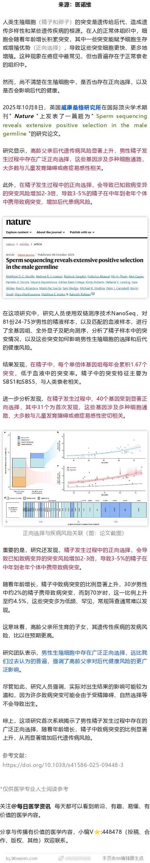 2025年10月8日,英国威康桑格研究所在国际顶尖学术期刊" Nature "上发表了一篇题为" Sperm sequencing reveals extensive positive selection in the male germline "的研究论文。