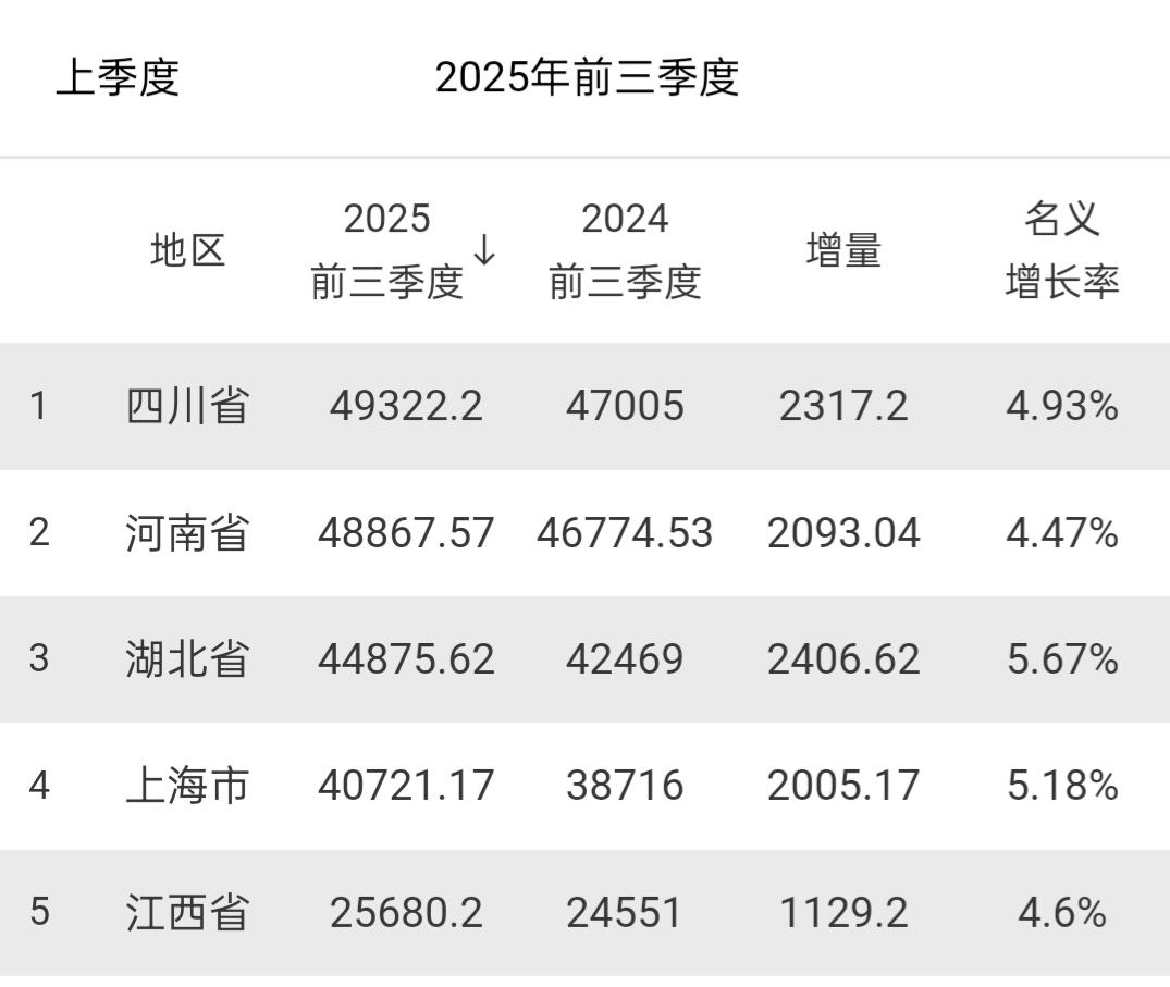 5个省市前三季度GDP新鲜出炉:湖北增量最高、上海突破四万亿 截止目前,我国已有5个省市前三季度GDP总量出炉了,从已出省市名义增速来看,湖北和上海名义增速超过5%,位居前二名,河南没有增速垫底,同比增长4.47%。 前三季度四川省经济总量接近五万亿,实现49322.2亿,较去年同期增加了2317.2亿,增量次于湖北,在已出省份中位居第二名,河南完成48867.57亿,较去年同期增加了2093.04亿,名义增长4.47%,河南经济增量低于四川省,导致与四川的经济差距扩大至454.63亿。 湖北和上海前三季度GDP总量也都超过四万亿,分别实现44875.62亿和40721.17亿,较去年同期分别增加了5.67%和5.18%,上海与今年前三季度成功突破四万亿,但与湖北的差距进一步扩大。 江西前三季度GDP实现25680.2亿,较去年同期增加了1129.2亿,名义增长4.6%,江西为已出炉省份中唯一经济总量低于四万亿的省份,且名义增速也仅高于河南省,位居倒数第二名。