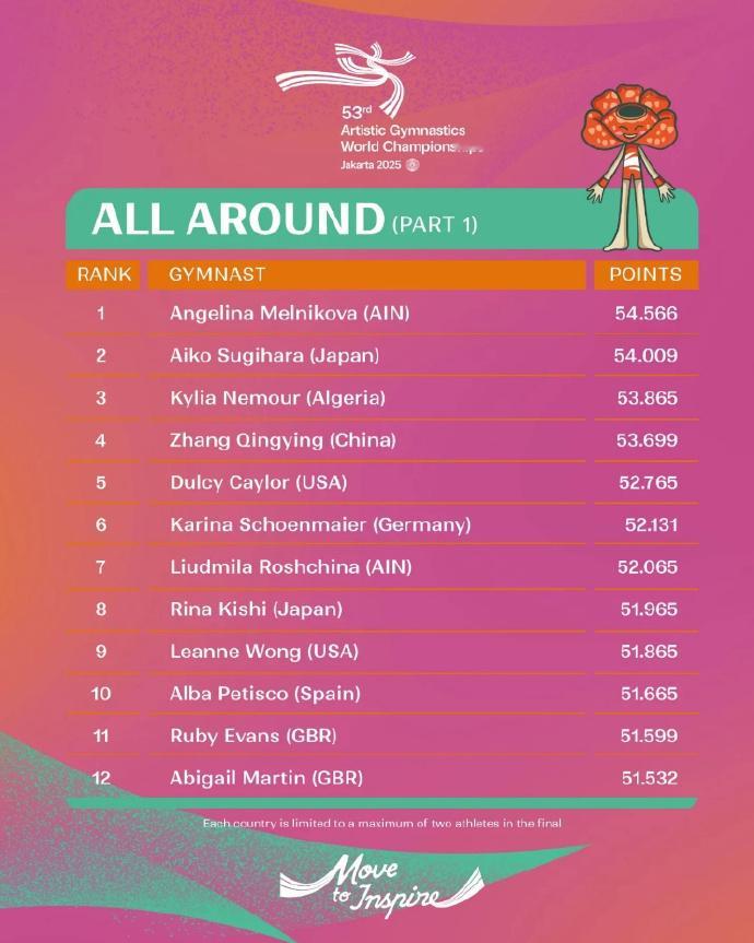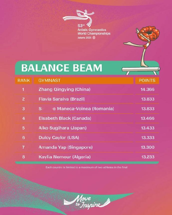 张清颖以难度和总分均列第一的成绩,晋级平衡木决赛;以资格赛第四的成绩,晋级全能决赛;