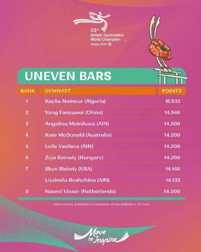 杨凡予微以资格赛第二的成绩,晋级高低杠决赛;