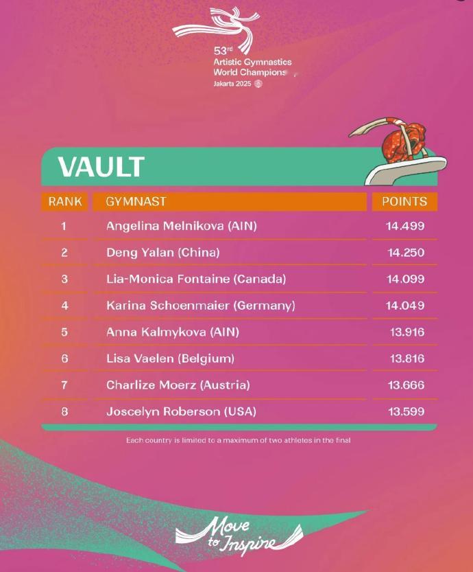 邓娅兰以资格赛第二的成绩,晋级跳马决赛;