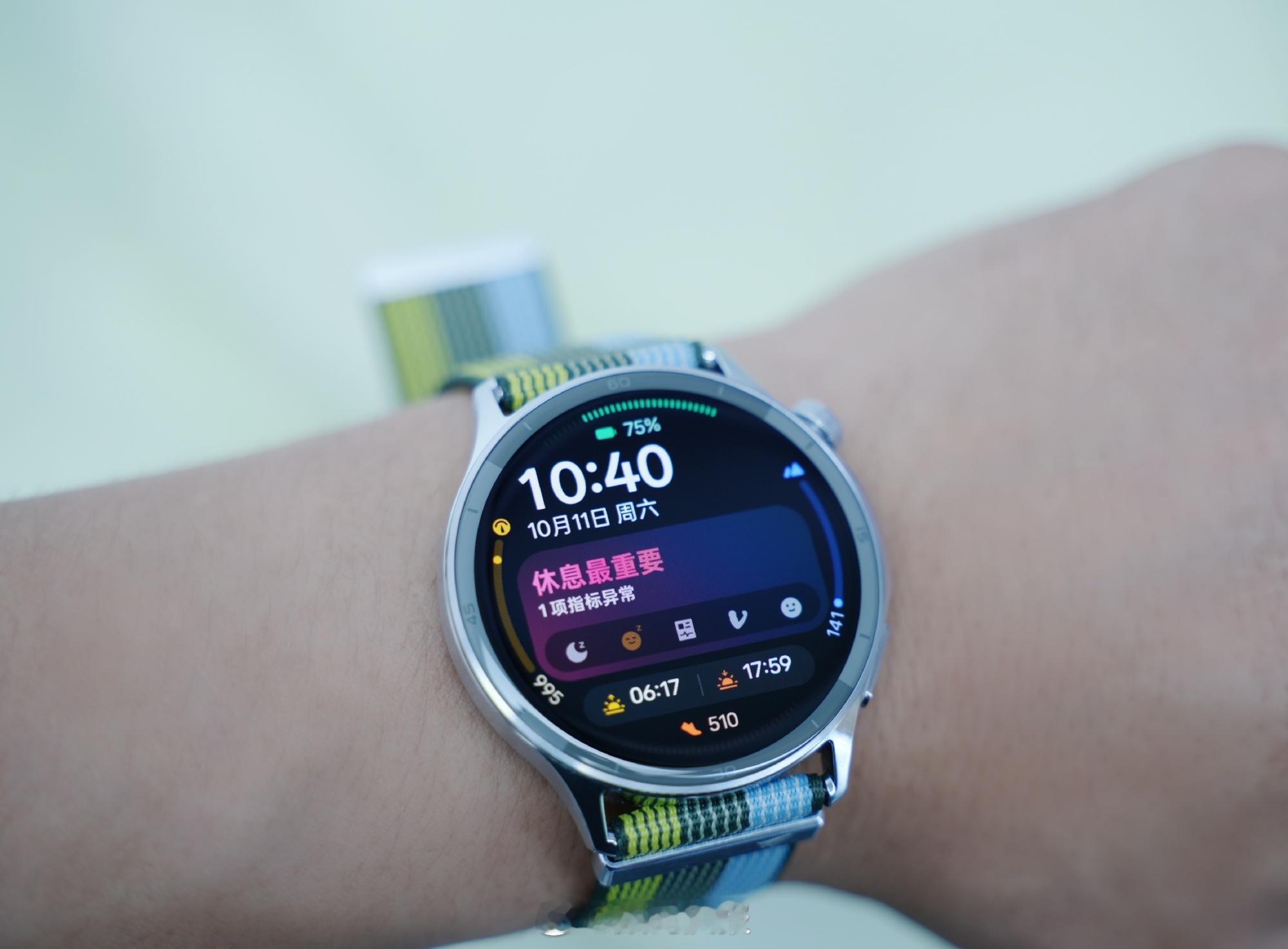 我选择的是跃动绿茵配色,蓝绿交织的编织表带不仅好看,更重要的是透气亲肤。相比传统智能手表,OPPO Watch S最让我满意的是它的无感佩戴。日常工作打字时不会再硌到手腕,穿羽绒服也能轻松滑入袖口,这些细节的改善让日常使用舒心不少。