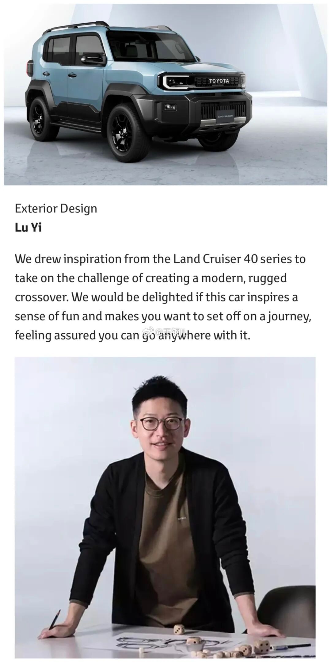 全新兰德酷路泽FJ与丰田Hilux Champ皮卡采用相同平台,车身长度较LC 250车型缩短约28厘米。
