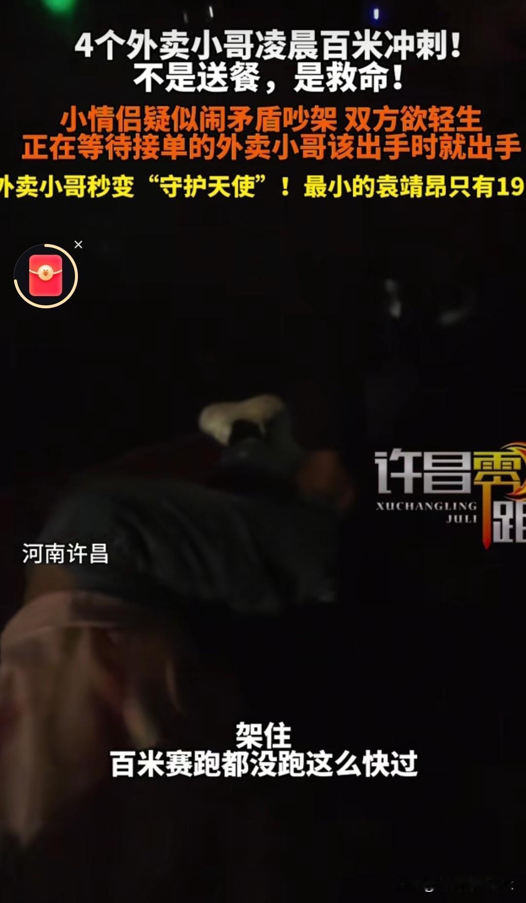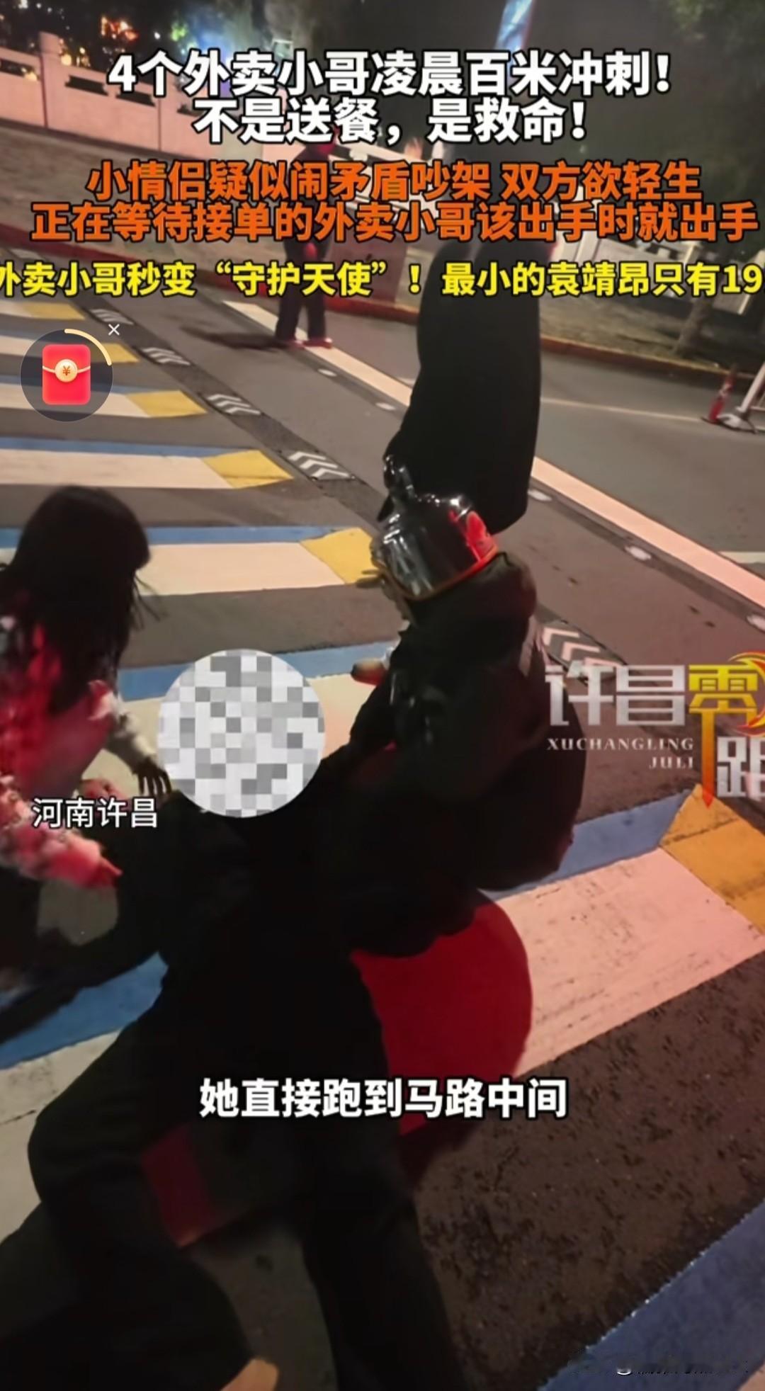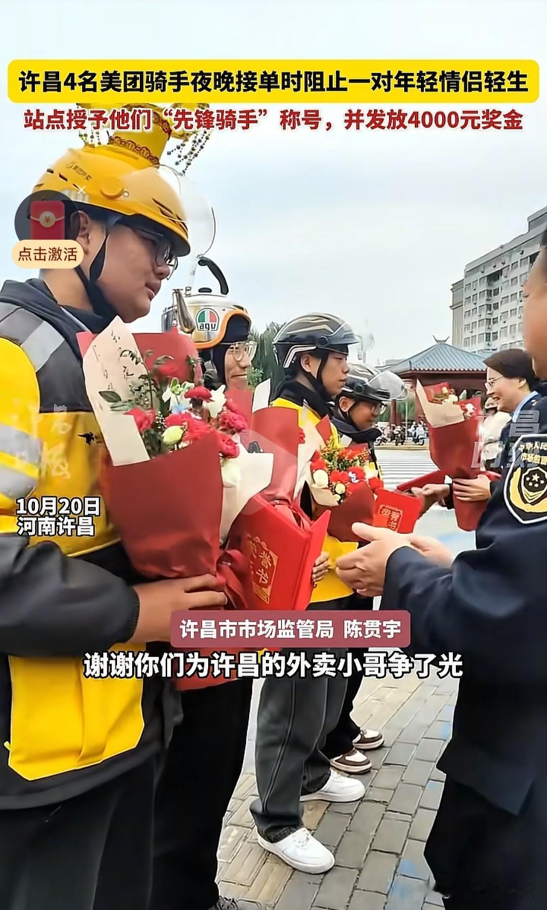 河南,情侣深夜吵架,男的往河跳,女的躺马路,忙坏四个外卖员,成功阻止了这对情侣轻生,站点授予他们“先锋骑手”称号,当网友看到四人组时,都乐呵了。 10月18日凌晨1点左右,许昌的4名外卖小哥在路边等单,一对情侣激烈的争吵引起了他们的注意。 突然,情侣中的男子快速边脱衣边向河边跑去,眼尖的外卖小哥李先生发现不对劲,“那男的看着不对劲,快点!壶!” 壶是他的同伴,四人以百米冲刺的速度,在男子翻栏杆时拉住。 等他们将男子拉下来后回头望向女子,“又咋了?” 他们发现女子又躺在了马路中央,他们是连拖带拽的将男子拉过来,又接着安抚女子。 此时男子看似平静,还找他们要了一根烟吸,就在大家以为没事的时候,男子脱掉鞋又跑去跳水,被大家再次拉住。 他们报了警,民警将两人带到所里安抚情绪。 深更半夜,如果不是4名外卖小哥在场,以这俩人极端的行为,指不定会为什么事故。 4名外卖员成功阻止了一对情侣轻生,他们是几名热心好青年,最小的才19岁,网友纷纷点赞,给予高度评价,外卖这个群体,高素质,乐于助人,危难时刻处处显身手。 站点授予他们“先铎骑手”称号,并共发放4000元奖金,对他们的行为表示赞扬和认可。 当网友们看到他们4位时,都禁不住开怀大笑,为什么有位外卖小哥叫“壶”?原来是他戴了个热水壶形状的头盔,另一位戴的是秦始皇皇冠形的头盔,被网友戏称“秦始皇”和“水壶哥”。 他们笑着说,戴这种头盔是为了给枯燥的生活彼此增添些乐趣。 都说这对情侣是绝配,两个极端的人在一起就容易矛盾频发,故事变事故就在瞬间。 但凡有一人懂得服软,不频频刺激对方,这事也发生不了,既然到了想解脱这一步,分手就是了,何必拿生命当儿戏,你的命是父母的,只有他们为你的愚蠢买单,痛不欲生。 为了所谓的爱情豁出命,又有什么意义?真有意外了,才知道那不是爱,另一方会为了保全自己,拼命向对方泼脏水。旬阳新郎就是最好的例子。 4名外卖小哥秒变“守护天使”,他们的行为值得宣扬和点赞,对于这对情侣来说是幸运的,但幸运不是随时会有的,希望这对情侣及他们的家庭要及时反省问题,互相作出改变,改变不了的话好聚好散也是不错的选择。