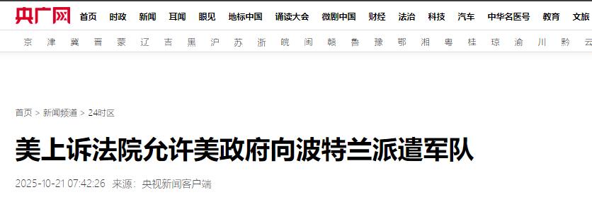 美国正式同意了,10月21日,美国上诉法院点头了,允许特朗普总统把军队派到波特兰市去,这事儿可闹大了! 特朗普敢这么折腾,靠的是1807年就定下的《叛乱法》,这法条堪称总统手里的“尚方宝剑”,只要总统认定某个地方乱到没法执行法律,就算州长跳着脚反对,也能直接派兵进城。 这法条刚出炉时是授权总统派兵打击“印第安人的恶意入侵”,几经修订后,适用范围扩到了“镇压暴动、国内暴力和保护民权”,核心没变的是总统那近乎独断的决定权。 说白了,这事儿全看总统下决心,州长同不同意根本不重要,国会也插不上手,难怪特朗普敢拿它当底气。 而这次针对波特兰的事儿从头到尾透着股荒诞劲儿,9月27日特朗普突然宣布要向这个民主党主政的城市派兵,理由是应对“国内恐怖分子”,国防部长第二天就发了备忘录,授权200名俄勒冈国民警卫队执行60天联邦任务,说是要保护联邦财产。 可俄勒冈州长蒂娜·科特克当场就炸了,说自己早上刚跟总统说过波特兰一切正常,所谓“饱受战争蹂躏”纯属社交媒体臆想,直言这是滥用职权,波特兰市长更不客气,直接说“这里不是军事目标”,总统要是真派兵,反而可能制造暴力。 而且,地方政府也没光动嘴,直接把联邦政府告上了法庭,10月4日联邦地区法官卡琳·伊默格特还真发了两周临时限制令,理由是波特兰的抗议根本没构成“叛乱危险”,当地警察完全能搞定。 结果10月21日上诉法院突然点头,给特朗普的派兵计划开了绿灯,这下州长再跳脚也没用了,毕竟法律程序上人家占了先。 更有意思的是各方的说辞,特朗普在采访里一口咬定波特兰是“纯粹的叛乱”,还放话说只要有人被杀、地方政府阻碍,就必然动用权力,可联合国人权机构都看不下去了,说联邦执法人员之前在波特兰就滥用武力,无端逮捕抗议者和记者,连市长泰德·惠勒参与游行时都挨了催泪瓦斯,6个民主党执政城市的市长还联名写信骂街,说这是践踏宪法,把联邦执法人员当私人军队。 所以,其实明眼人都看得出来,这事儿从头到尾都带着党派味儿,波特兰是民主党的地盘,之前特朗普往洛杉矶、华盛顿特区派兵,也全挑民主党主政的城市下手,共和党人夸他“以实力维和平”,民主党人骂他“煽动对立”,连联邦和地方的矛盾都成了党派斗争的工具。 要知道,2006年国会想修订《叛乱法》扩大权限,就因为多州州长反对赶紧作废了,现在倒好,总统直接拿老法条当武器,把两百年前对付印第安人的规矩,用到了今天的美国城市里,真是荒谬。 说实在的,这事儿闹大真不是因为波特兰的乱局有多严重,而是这把“尚方宝剑”的出鞘太随意,近三十年没人敢动的法条,如今被拿出来对付党派对手控制的城市,州长的反对、地方的诉讼、甚至法官的临时禁令都拦不住,最后全看上诉法院的一句话,所谓的联邦制平衡早就被搅得稀烂,最后还是得看权力的脸色。