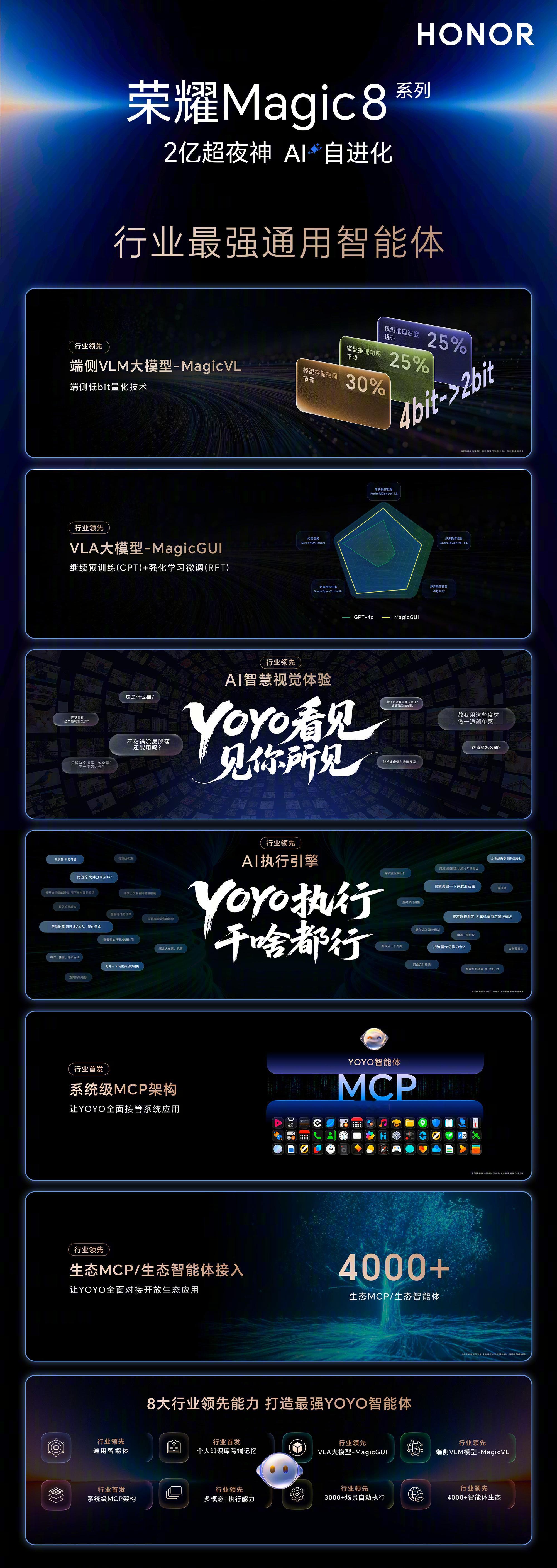 双11算不明白让AI算荣耀Magic8系列的YOYO智能体之所以能成为消费者的“省心搭子”,关键在于其强大的端侧AI技术和生态整合能力。据央视财经报道,YOYO已达到了中国信通院权威认证的L3卓越级水平,并与行业巨头深度合作,构建起开放的AI终端生态。其支持超过3000种自动执行场景,涵盖购物比价、优惠领取、图像识别、语音交互、知识讲解、热量测算等多个维度。这意味着用户无需依赖多个App或手动操作,只需通过一部荣耀Magic8手机,就能完成从“发现需求”到“实现满足”的闭环。这种智能化的手机交互体验,代表了中国科技企业在AI应用领域的创新实力。