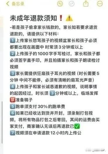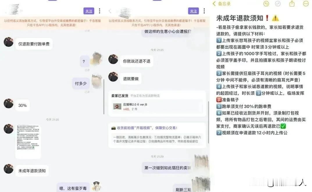 商家:“退款可以,需要先狂扇孩子5分钟。” “中间不能停,要有清晰的扇耳光声音” 平台客服→“抱歉平台无法强制,建议双方协商沟通。” 李云女士11岁的女儿在千岛App购买了500多元的卡牌,被妈妈发现后,找到卖家,希望卖家能退货退款,然而,卖家却提出了荒诞的无理退款要求: “上传家长怒骂孩子的视频 、狂扇孩子耳光的视频(时长需要5分钟,中间不能停,必须有清晰的扇耳光的声音)”。 这种退款要求,简直是闻所未闻,估计很多网友都是第一次听说吧? 像这种现象,换了是你,你会怎么做? (消息素材来源:深圳晚报权威报道)