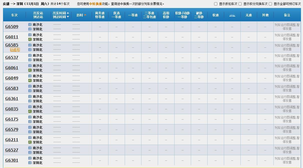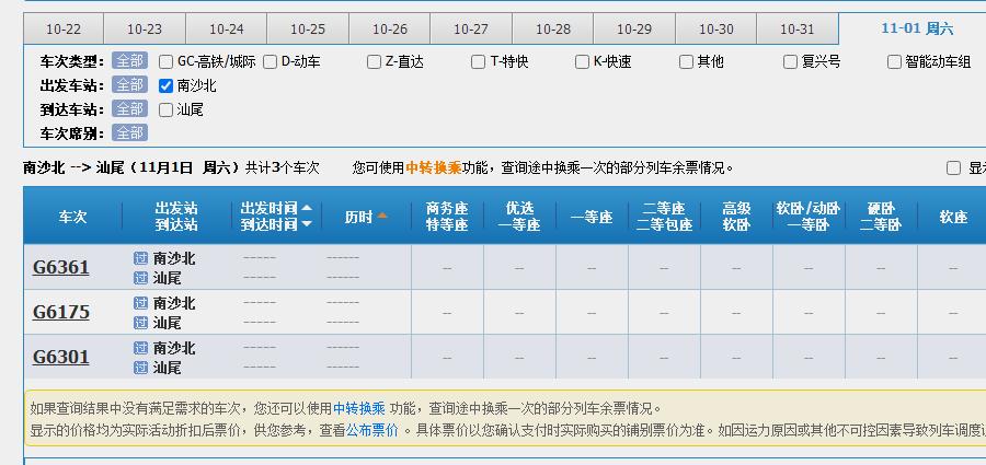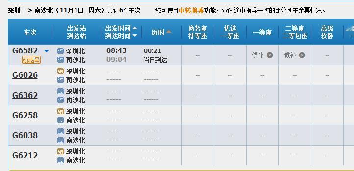 【喜大普奔!南沙北站11月1日起恢复高铁班次】好消息!好消息!在改名南沙北站之后,庆盛高铁站终于要恢复高铁班次了! 12306官网显示列车运行图调整,11月1日起南沙北站将恢复正常的高铁停靠班次,告别之前一天只有两班的尴尬局面。 在官网可以查到,从南沙北去往深圳北,一共显示14个车次,而且还有3个停靠福田站的班次。不过如果是从深圳北回南沙北方向,则显示只有6个车次!南沙北去往虎门则有8个车次,回程则只有3个车次。 而更好的消息是,去往小编的家乡汕尾,可以查到竟然有了3个车次,之前小编基本上都是需要在深圳北转乘的。去往汕头的直达班车也有了2个车次! 直达香港西九龙的班次有6个车次,而回程方向则只有1个车次。 往西部的方向,在南沙北站有直达列车G6026和G6038,去往韶关、郴州西、衡阳东、株洲西、长沙南;G6212则可以去到佛山西、三水南、肇庆东。 不过班次依旧还是很少,要去往其他更多的目的地,南沙人还是需要在广州南或者深圳北进行换乘。