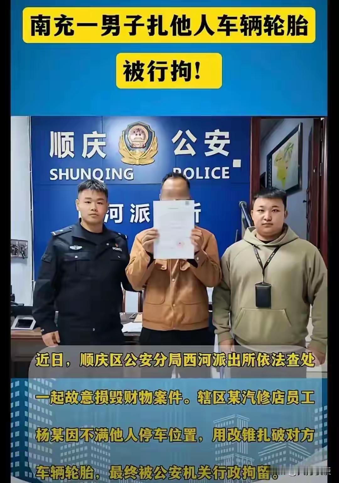 南充扎胎事件后续!员工被拘,店铺道歉,当初的嚣张去哪了 南充扎胎事件终迎结果:涉事员工杨某被行政拘留10天,店铺股东公开道歉,当初的嚣张气焰荡然无存。 此前,罗女士将车停在修车店外公共车位,遭员工杨某用改锥扎胎,车辆还被前后围堵。面对质问,店家不仅拒不赔偿,还倒打一耙称扎胎是“给教训”,员工更比剪刀手嘲讽路人。监控清晰记录下全过程,暴露其长期霸占公共车位的行径。 随着舆论发酵,警方依法处置,杨某因故意毁坏财物被拘。店铺股东连夜道歉,赔偿新轮胎并开除杨某,还被追加2万元罚款。这场闹剧证明:公共空间不容私占,嚣张跋扈终要为违法行为买单。文内信息来源:(权威媒体报道)作品声明:内容取材于权威媒体,仅供参考。