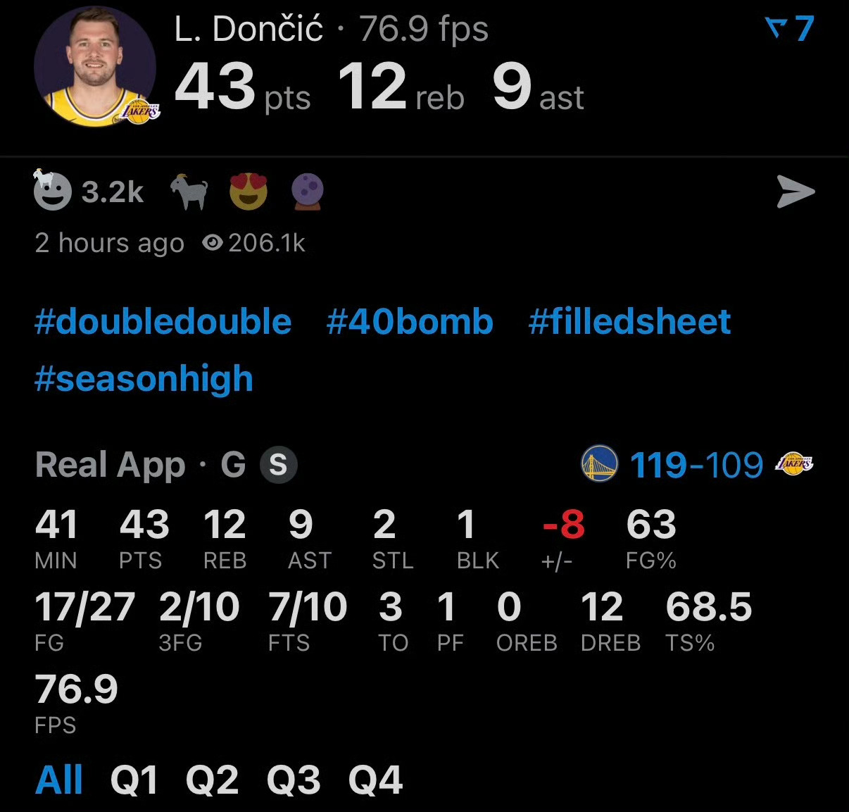 今日比赛对阵勇士,东契奇出战40分钟,27中17,其中三分10中2,罚球10中7,得到43分12板9助2断1帽。