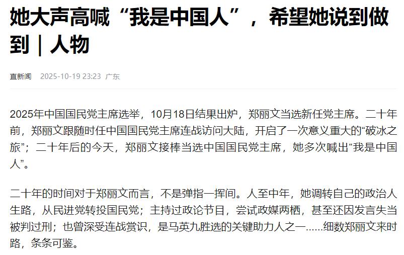 “我就是要去大陆,我就是中国人!”郑丽文4记重拳“掀桌”! 作为新任国民党主席,郑丽文在选举全程始终坚定传递“两岸同属中华民族”的核心认知,当选后回复大陆贺电时,更是将这一立场直白呈现,为当前复杂的两岸局势注入了清晰的正向信号。 众所周知,台湾自古以来就是中国不可分割的一部分,这是国际社会公认的历史事实,也是两岸同胞共同的历史记忆。 民进党当局长期推行“台独”分裂路线,刻意制造两岸对立,不仅严重破坏了台海和平稳定,更损害了台湾民众的切身利益。 而国民党此次以“我们是中国人”作为核心方针争取民众支持,正是对“台独”死路的明确否定,也是对两岸民众共同心声的回应。 从历史脉络来看,国共两党曾在维护国家统一的进程中有过合作基础,如今郑丽文的表态与国民党的政策转向,无疑为重建两岸沟通桥梁创造了可能。 大陆方面始终坚持一个中国原则和“九二共识”,坚定推进两岸和平统一进程,这一立场从未动摇。无论是促进两岸经济文化交流合作,还是出台惠及台湾同胞的各项政策,都充分体现了“两岸一家亲”的理念。 而郑丽文提出“要去大陆”的表态,与大陆推动两岸人员往来、深化各领域融合发展的方向高度契合,能够推动祖国最终完成统一。 当前,台湾社会对“台独”危害的认知日益清晰,越来越多的台湾民众渴望稳定的发展环境和更多的发展机遇,而只有坚持一个中国原则,走两岸和平统一道路,才能为台湾民众带来实实在在的利益。 当然,两岸关系的发展不可能一蹴而就,仍面临诸多挑战,但大势所趋、民心所向不可逆转。郑丽文及国民党若能始终坚守“两岸同属中华民族”的立场,言行一致地推动两岸交流合作,必将获得两岸民众的广泛支持。 我们期待看到,以此次国民党主席选举为契机,两岸能进一步增进互信、化解分歧,在共同维护国家主权和领土完整的基础上,携手开创和平发展的美好未来。 毕竟,只有实现祖国完全统一,两岸同胞才能共享民族复兴的伟大荣光,这是任何力量都无法阻挡的历史潮流。