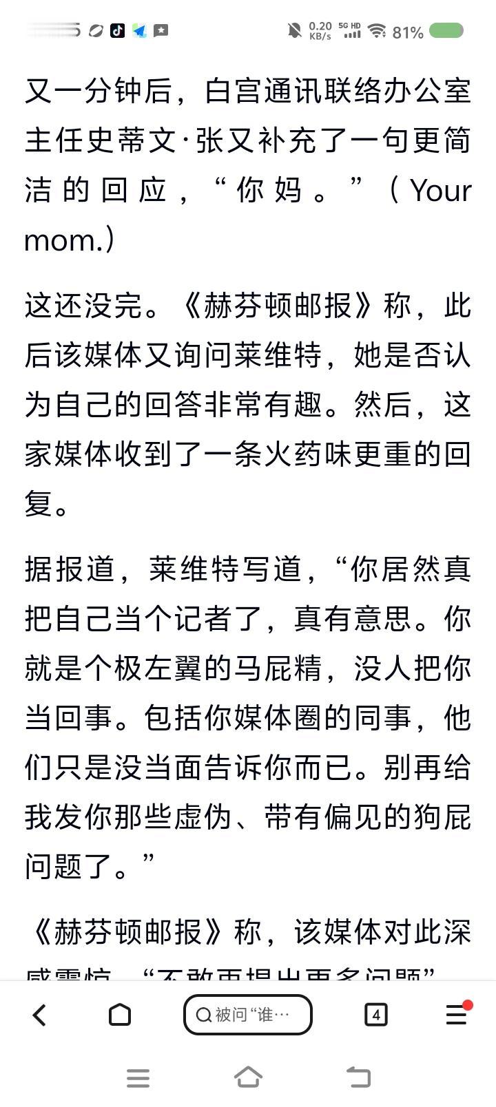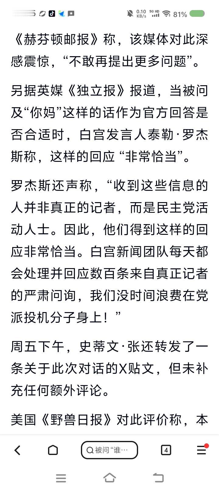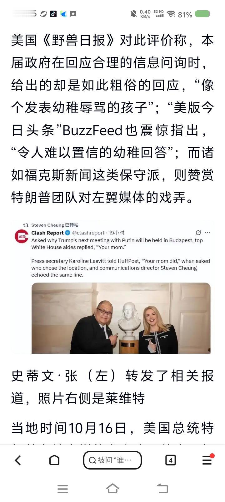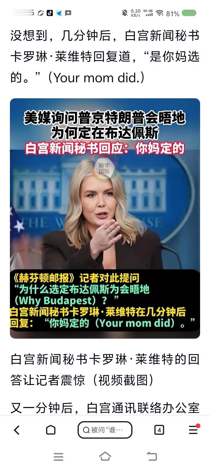 白宫官员失言?—— 据报道,近日,有记者问白宫某官员:“为什么美俄元首会晤定在布达佩斯?”对方答:“你妈定的。”记者难以置信。随后,白宫另一官员重复了这一回答。 点评: 这种失言显而易见,偏偏网上有人认为他们怼得好。难道补助发了?这些人叫得更卖力了。 为什么那两位这么回答?因为上行下效。特朗普本身就对媒体无礼,前不久又发布规定:白宫记者出入白宫需要特朗普特别许可,导致大批记者辞职。 首先,这些记者都是专门报道白宫活动的,在白宫应该有备案,不是小报记者。 其次,记者立场,你可以不喜欢;记者的问题,你可以不回答。你说无礼的话干啥? 第三,这暴露出特朗普政府的无知、短视、无能。 第四,特朗普团队可能不关心也没有能力关心为什么美俄元首会晤选在布达佩斯。没准,特朗普认为那儿新建了高尔夫球场。