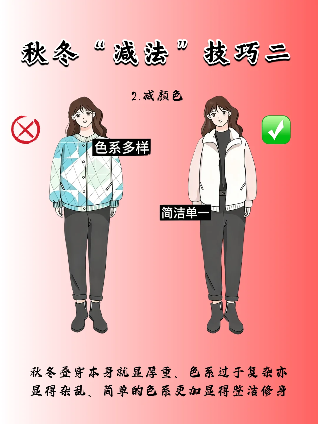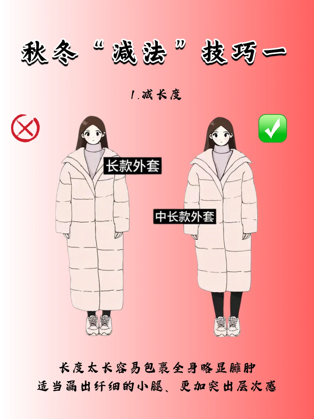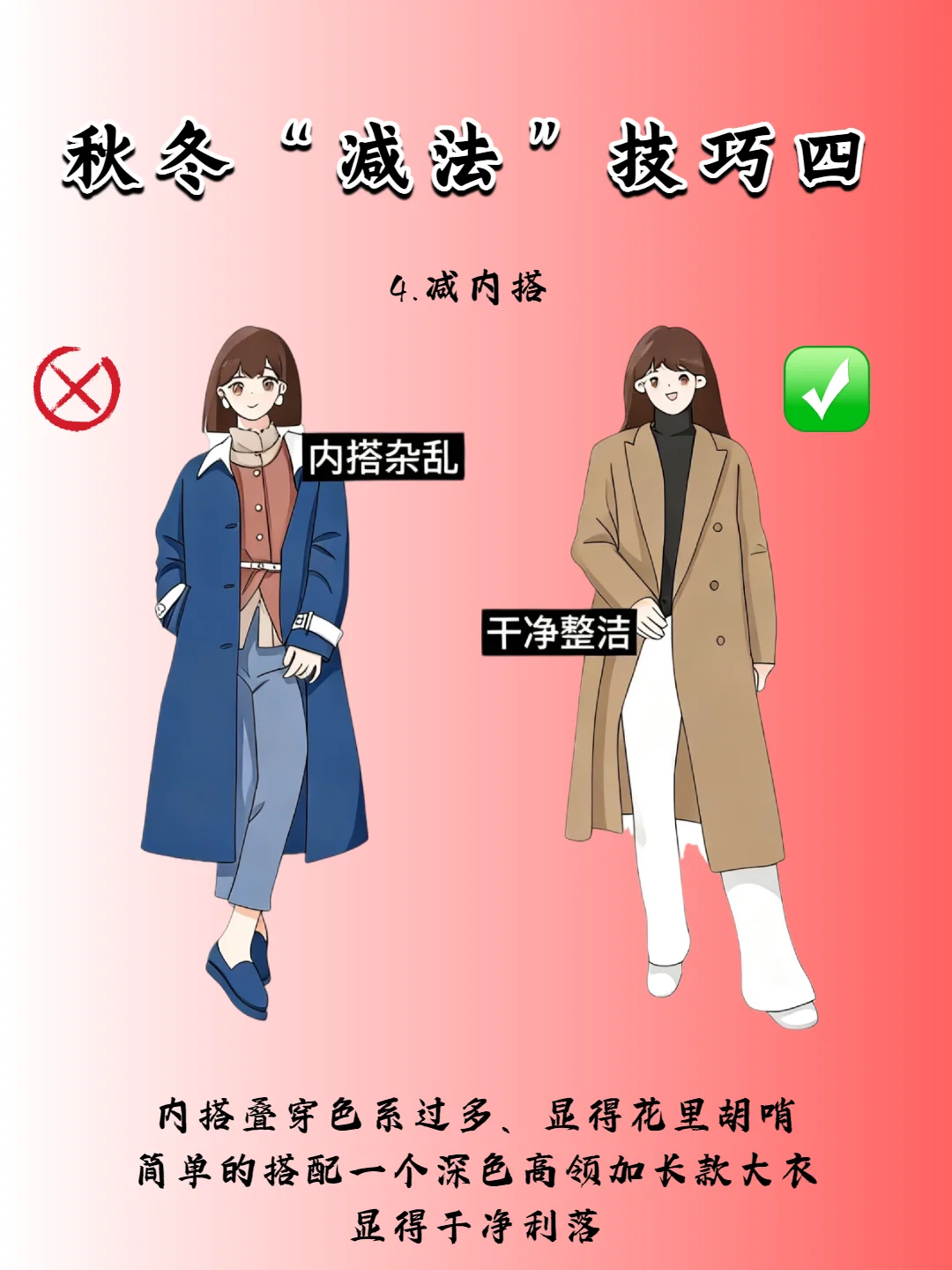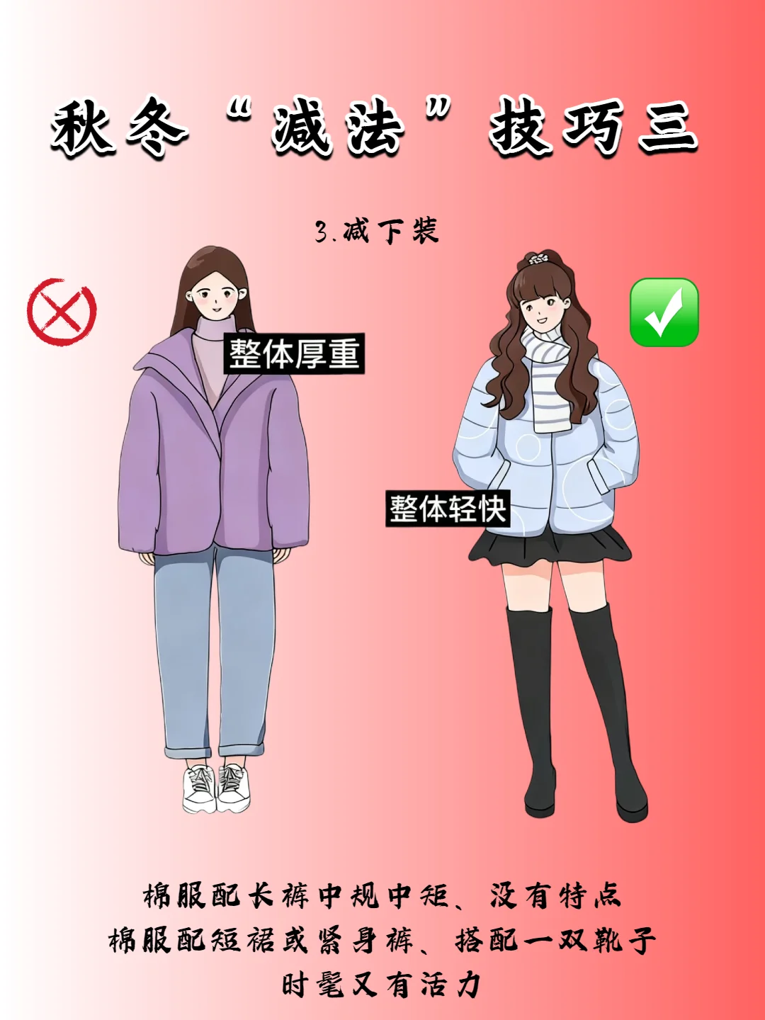 秋冬别再穿得臃肿啦!宝子们!秋冬一到,是不是总担心“穿太多显臃肿”? 其实只要学会**“减法”叠穿**,保暖的同时还能利落又高级~ 今天分享4个超实用的减法技巧,轻松告别臃肿感~ ✨ 技巧1:减长度——露出小腿更显层次 长款外套虽然保暖,但太容易把全身“裹成粽子”! 换成**中长款外套**,适当露出纤细的小腿,不仅能打破沉闷,还能突出穿搭层次感,瞬间显瘦~ ✨ 技巧2:减颜色——简洁色系更显高级 秋冬叠穿本身就有厚度,要是色系还太复杂,会显得特别杂乱! 不如选**简洁单一的色系**搭配,既显整洁,还能悄悄藏住肉肉,高级感一下就出来了~ ✨ 技巧3:减下装——换个下装更显活力 棉服配长裤,虽然保暖但中规中矩没亮点,还容易显厚重。 试试棉服搭**短裙/紧身裤**,再配一双靴子,瞬间变得时髦又有活力,视觉上也更轻快~ ✨ 技巧4:减内搭——干净内搭更利落 内搭叠穿色系太多,容易花里胡哨还俗气。 不如简化内搭,比如用**深色高领衫+长款大衣**,整体看起来干净又利落,气质都提升了~ 这4个“减法”技巧真的超实用,秋冬照着穿,既能保暖,又能摆脱臃肿感,轻松穿出高级感~ 宝子们快码住,下次搭配直接用~ #秋冬穿搭 #叠穿技巧 #显瘦穿搭 #减法穿搭 #搭配分享 #搭配挑战 #三层穿衣法则 #不同温度怎么穿 #穿搭层次感 #穿搭底层逻辑