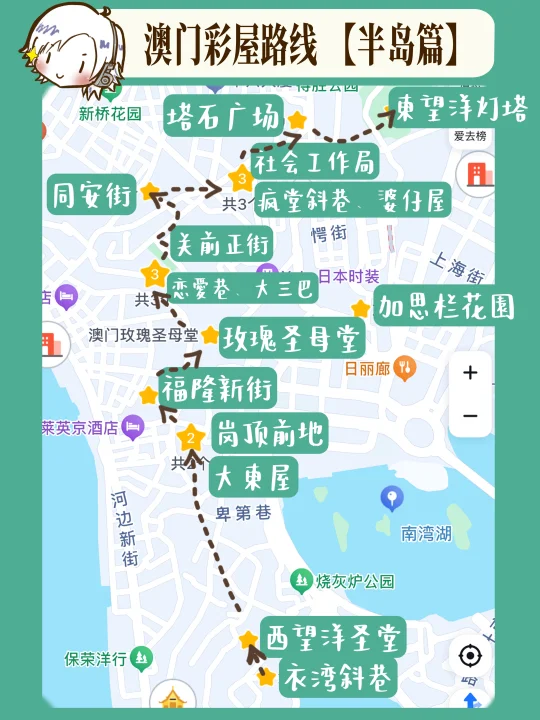 🚩行程路线:衣湾斜巷-西望洋圣堂-大东屋-岗顶前地-福隆新街-玫瑰圣母堂-(恋爱巷-大三巴)/加思栏花园-关前正街-同安街-社会工作局-疯堂斜巷-婆仔屋-塔石广场-东望洋灯塔