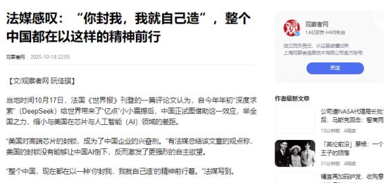 来自法国媒体的消息说,整个中国都在散发一种精神,那就是,别国封锁,它就自己创造。 法国媒体强调,美国对芯片的封锁,反倒促成了中国加速创新,加快创造。 这种变化让美国半导体巨头们惊掉了下巴——原本想卡住中国脖子的“杀手锏”,如今却成了中国科技企业的“兴奋剂”。 2018年美国开始对华芯片制裁时,白宫以为只要切断高端光刻机和AI芯片供应,就能让中国科技产业陷入瘫痪。 但他们没料到,中国企业的反应不是退缩,而是闷头搞研发。比如长江存储的工程师们在实验室里泡了三年,硬是在被封锁的情况下研发出232层3D NAND闪存芯片,层数超过三星、美光等国际巨头。 更厉害的是他们绕过国际专利壁垒,发明了Xtacking架构,把存储单元和控制电路分开生产,既提升性能又降低成本。到2025年,长江存储首条100%国产化芯片生产线即将试产,从设计到设备全是中国造。 这种“被逼出来的创新”在AI芯片领域同样明显,美国禁止英伟达向中国出口H100、A100等高端GPU后,华为昇腾910C芯片迅速顶上。 这款芯片用双芯片封装技术,把两颗昇腾910B拼在一起,算力直接翻倍,性能追平H100。更厉害的是,华为还构建了百万卡集群系统,通过软件优化弥补制程差距,让国产AI算力在2025年占据国内市场40%份额。连英伟达创始人黄仁勋都承认,美国的制裁让英伟达在中国市场份额从95%暴跌至零,而华为等中国企业正在接管这个全球最大的AI芯片市场。 而这技术突破背后是中国产业链的全面觉醒,过去三年中国半导体设备企业实现了从0到1的跨越:北方华创攻克刻蚀机的高深宽比难题,中微半导体在MOCVD设备上取得突破,盛美半导体打通清洗工艺。 2025年8月,璞璘科技研发的纳米压印光刻机正式交付芯片厂,这款设备不需要极紫外光,直接用模板“压”出10纳米以下的芯片图案,全套技术自主可控。这种设备不仅成本低,而且维护简单,在空气环境下就能工作,直接打破了日本企业在该领域的垄断。 政策支持也为创新提供了强力保障,成都高新区2024年推出的集成电路产业新政15条,对流片研发成本最高补贴50%,单个项目补贴上限达3000万元。国家集成电路产业投资基金二期更是密集投资设备、材料领域,2024年上半年先后注资集益威半导体、臻宝科技等企业,重点支持刻蚀机、薄膜设备等“卡脖子”环节。这些政策让中国半导体产业链从设计、制造到封测形成闭环,2025年国产设备在28nm及以上制程的市场占有率已超过90%。 最让美国头疼的是,中国的创新不仅体现在技术层面,更体现在产业生态上。过去三年,中国建立了从EDA设计软件、光刻胶到晶圆材料的全产业链体系。比如华为海思AC9610高精度ADC芯片,采样率达2Msps、精度24bit,性能超越德州仪器同类产品,已在工业自动化、地震勘探等领域实现批量替代。国产EDA工具的市场份额从2022年的不足5%提升至2025年的18%,逐步打破Cadence、Synopsys的垄断。 这种变化正在重塑全球半导体格局。2025年中国成熟制程芯片(28nm及以上)的全球市场份额已达28%,预计2030年将接近40%。日媒《日经亚洲》评论称,中国通过低成本的SiC衬底和成熟芯片发动“价格战”,迫使欧美企业降价应对,英飞凌、意法半导体等巨头的净利润在2024年分别暴跌23.2%和60%。更讽刺的是,三星为了维持竞争力,竟考虑向长江存储购买400层NAND闪存专利授权,当年的“制裁者”如今不得不向“被制裁者”低头。 美国的封锁政策最终搬起石头砸了自己的脚。原本想通过技术垄断保持优势,却让中国形成了“设计—制造—应用”的自主生态。正如法国《世界报》所言,这场科技博弈中,美国的“小院高墙”不仅没能困住中国,反而激发了中国科技产业的创造力。当封锁变成动力,当困境化作燃料,中国芯片产业的崛起已势不可挡。 来源:观察者网 【法媒感叹:“你封我,我就自己造”,整个中国都在以这样的精神前行】