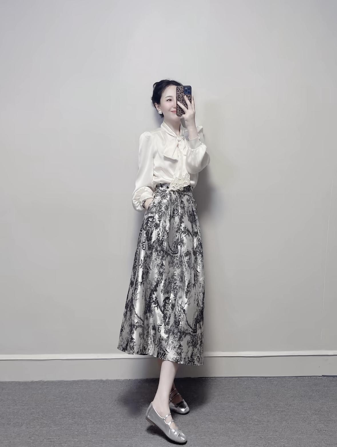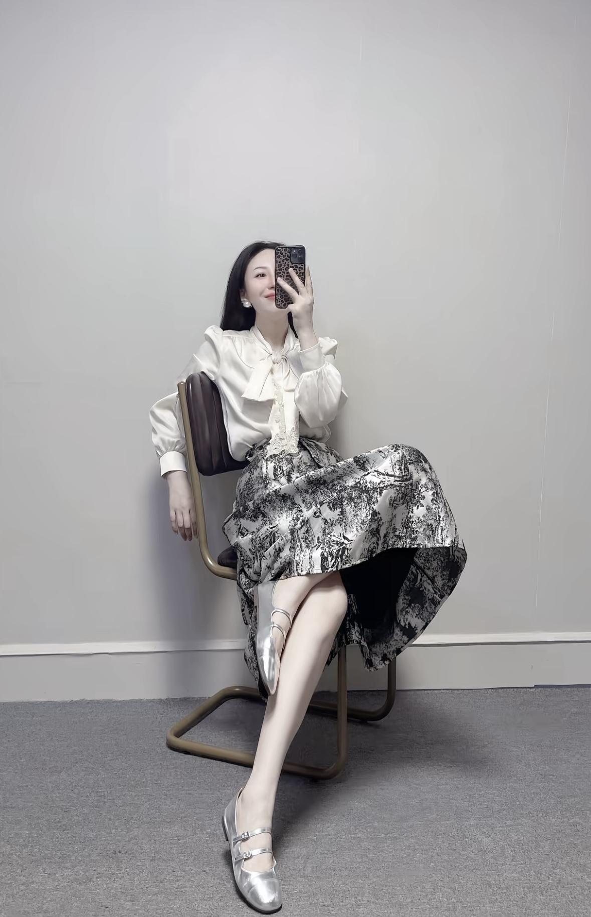 白色带黑蝴蝶结的衬衫,配黑色短裙,再拿个白色包包,简单又好看,日常出门这么穿挺不