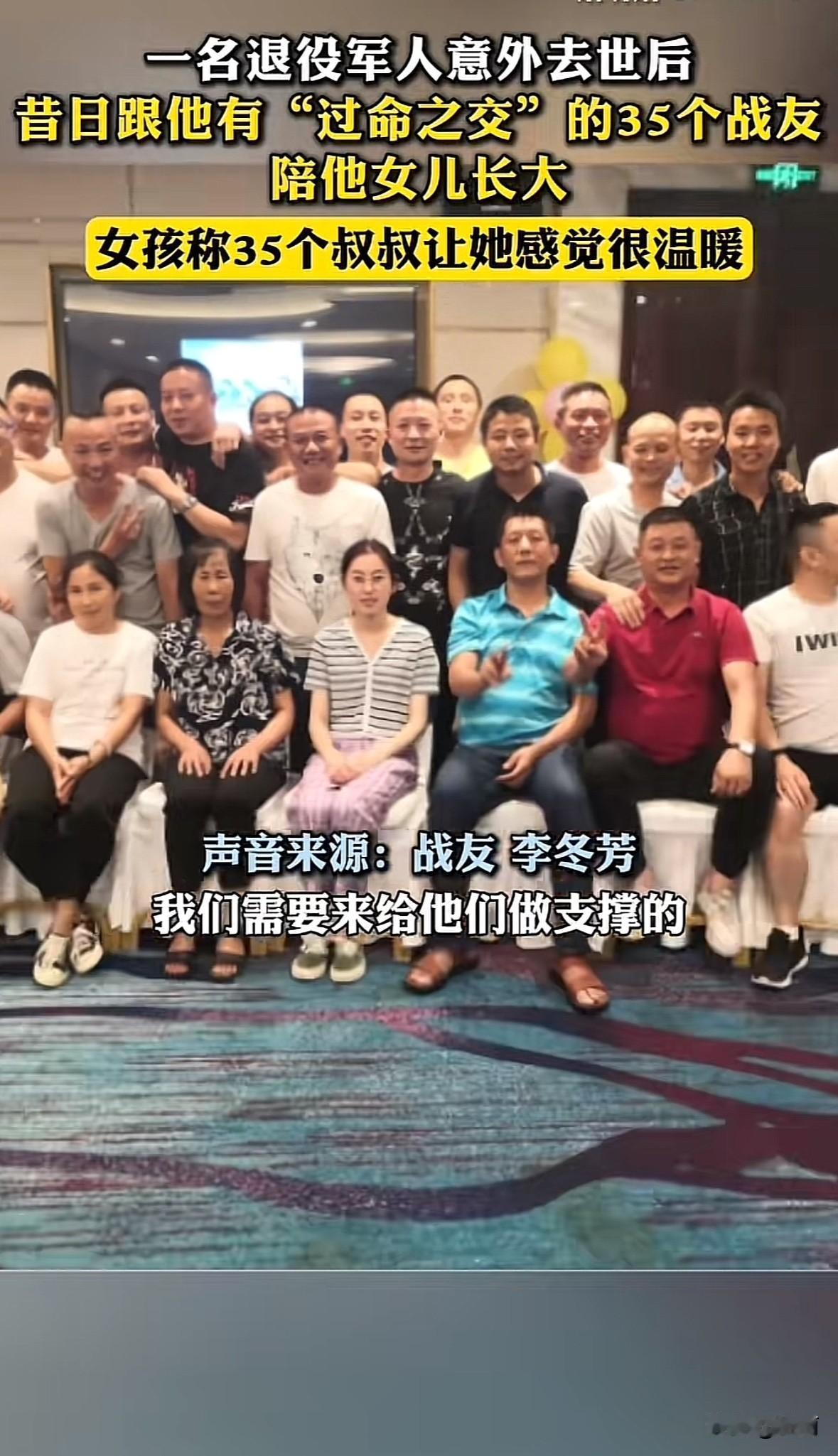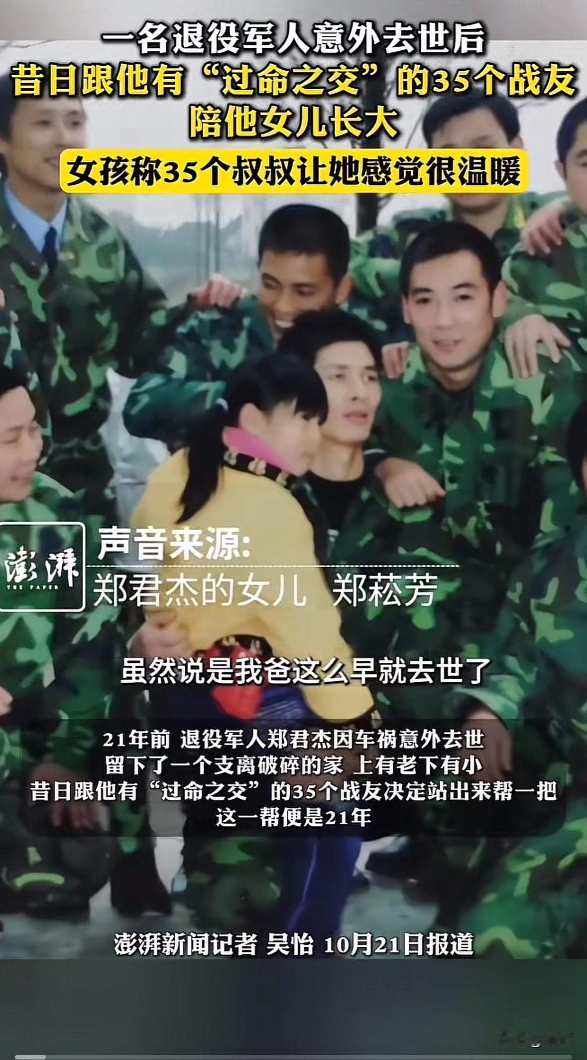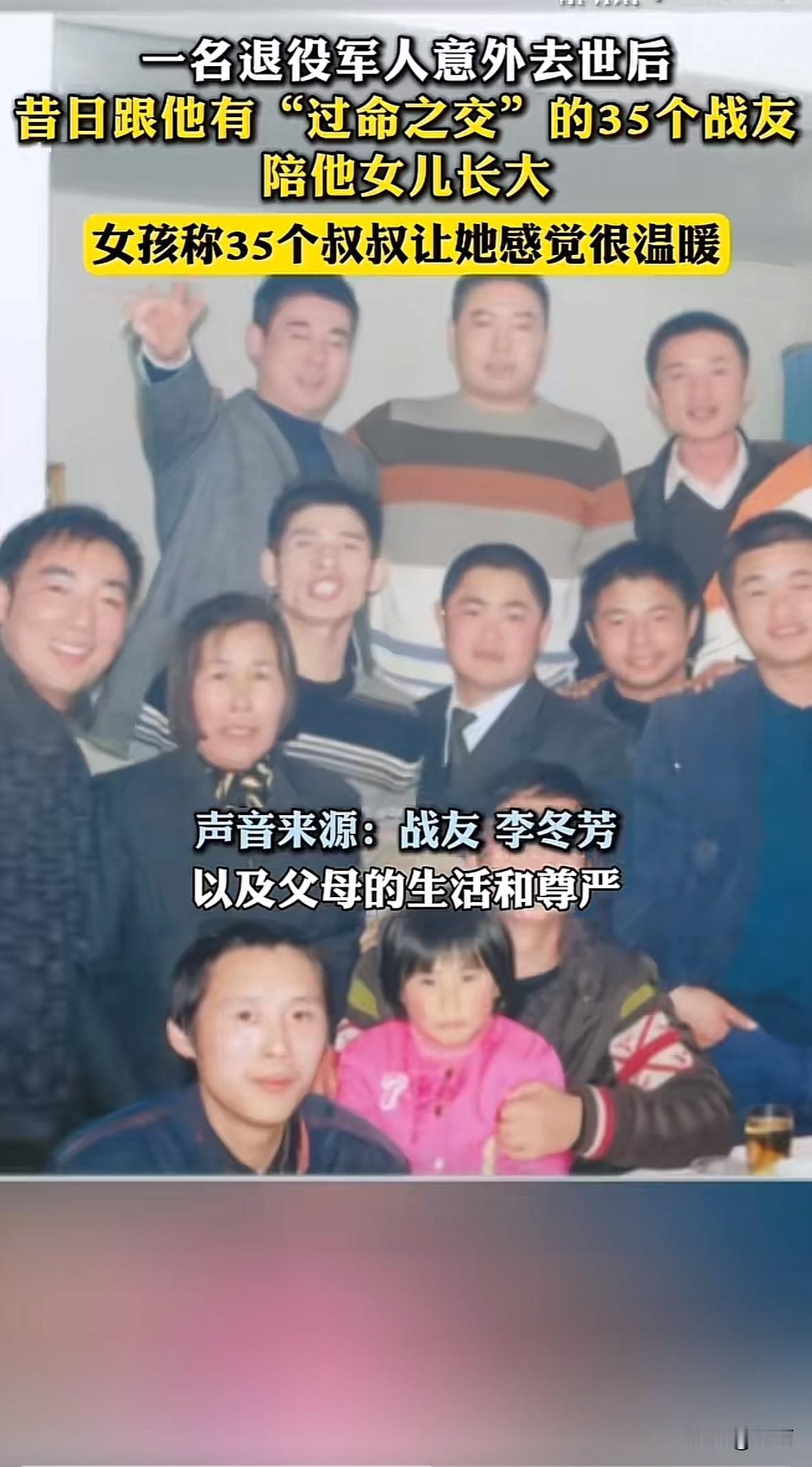 2004年,浙江嘉兴退役军人郑君杰因车祸去世,留下3岁的女儿郑菘芳和年迈父母。他的35位战友,曾一同入伍、参与1998年抗洪救灾,有着过命交情,当即决定接手照顾这个家。 这一帮就是21年。战友们凑钱成立帮扶基金,供孩子上学、给老人买药。家长会有人替开,老人病了轮流陪护,逢年过节带物资探望。郑菘芳遇校园霸凌,战友们立刻出面解决。 如今郑菘芳已大学毕业参加工作。35位叔叔的守护,让她健康长大。 这哪是战友,分明是亲人。没有血缘却重承诺,不计回报的坚守,把“一声战友,一生兄弟”刻进了行动里。这种纯粹的善意和担当,正是最动人的社会正能量。