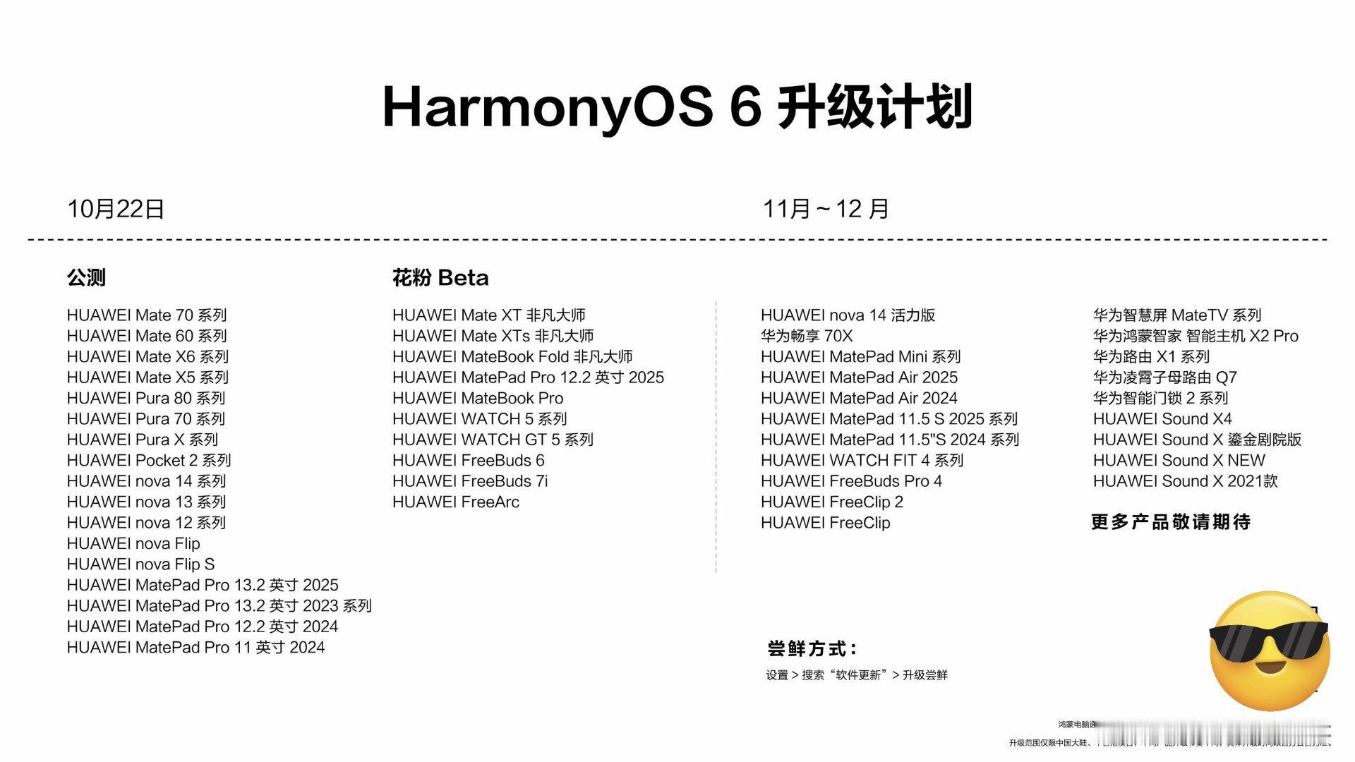 来了来了,华为公布鸿蒙6升级机型,共有90多款机型开放升级鸿蒙6,更多产品敬请期待[二哈]