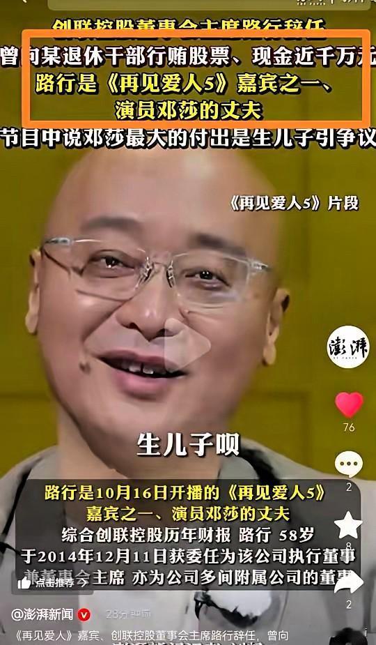 《再见爱人》的导演刘乐怕是真要气疯了!谁能想到,《爱5》刚开播就可能要停播,一颗老鼠屎彻底搅黄了整锅粥。 最受关注的嘉宾路行,前阵子还靠“爹味发言”刷存在感,转头就被扒出向公职人员行贿近千万——股票、现金、福卡一样不少,受贿者都已经判刑了。 更讽刺的是,节目刚播他就辞了公司主席,现在看来更像早有预谋。 这哪是背景没查清楚?分明是节目组把“话题度”放在了“底线”前面。