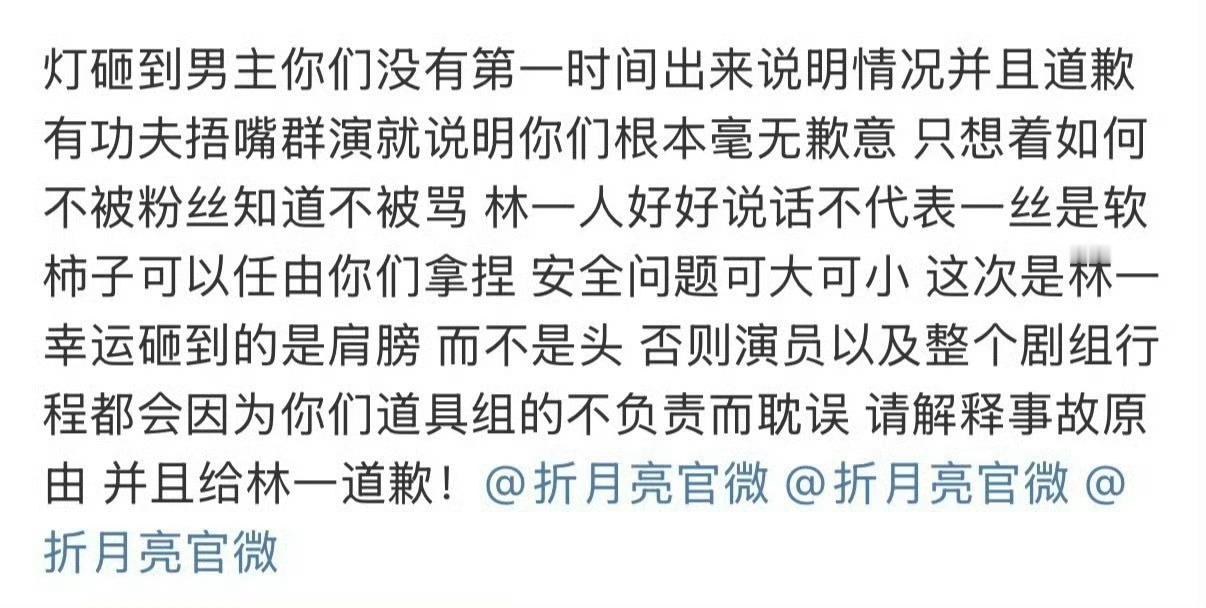 《折月亮》剧组回应林一受伤一事了,此前林一粉丝希望剧组道歉![吃瓜][吃瓜][吃瓜]林一