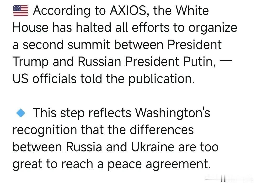 白宫已停止组织特朗普总统与俄罗斯总统普京第二次峰会的一切努力。此举反映出华盛顿认识到俄罗斯和乌克兰之间的分歧太大,无法达成和平协议——据 AXIOS 报道,美国官员向该媒体表示