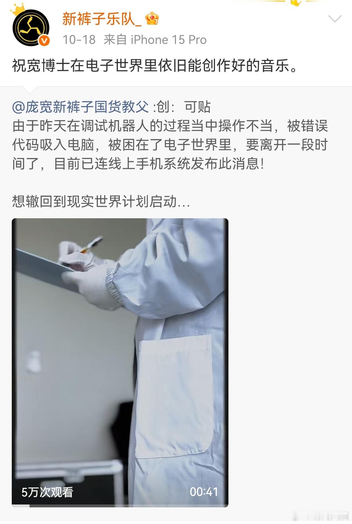 发博回应:“庞宽是个失控的AI机器人,在进行更疯狂的计划,并没有离队。”