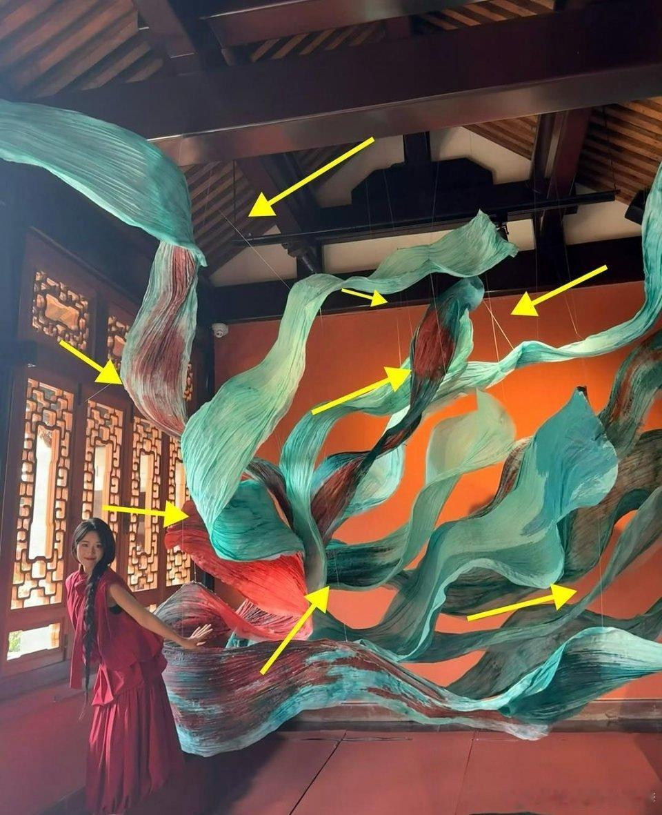 为了给蓝盈莹拍摄这组美图,团队小伙伴也不容易,用丝线把飘带吊在悬梁上,最大程度营造飘带的飘逸感,而不是直接靠后期P图处理 ​​​